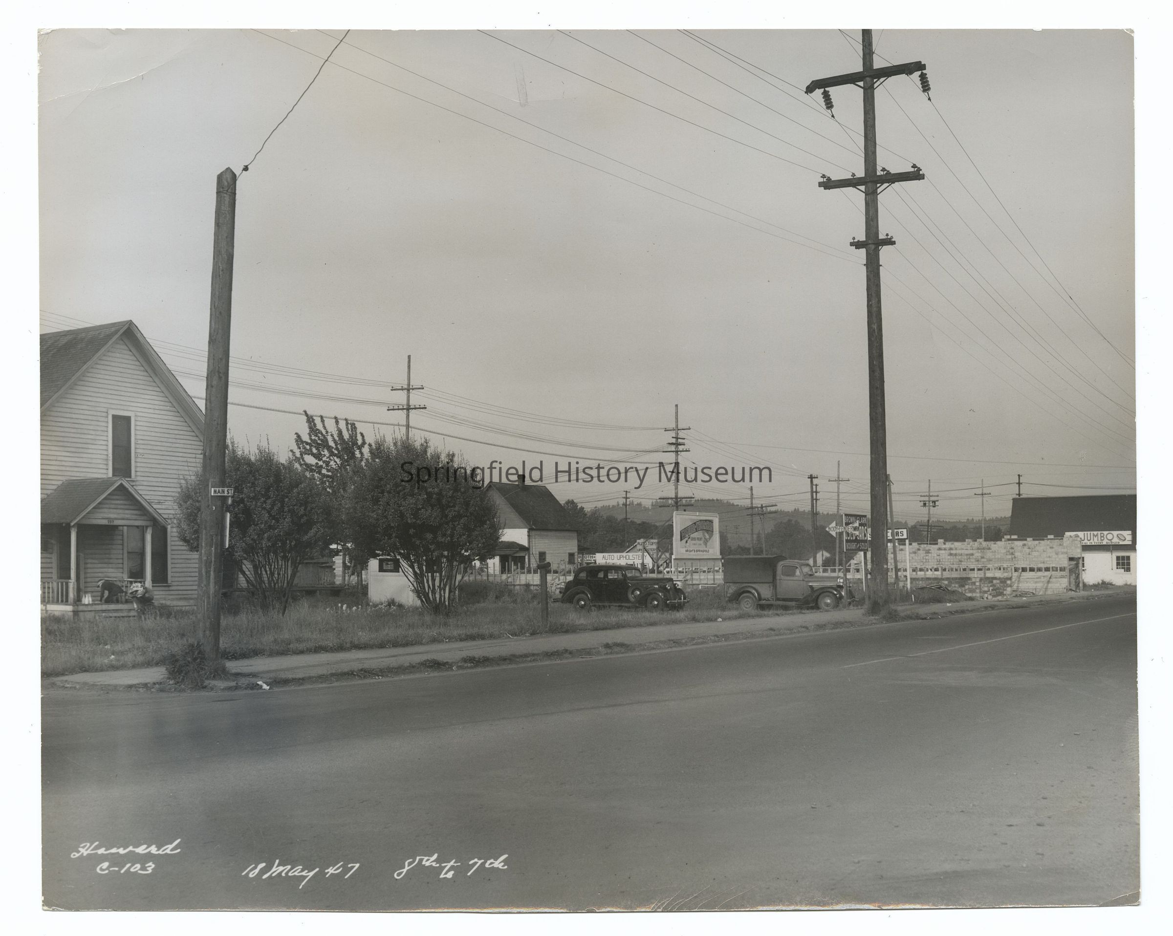 Photograph of Main Street, 8th to 7th, Springfield, May 18th 1947, shows: Houses (#757), Brown and Clark Used Cars, Jumbo BurgersPhotograph Details