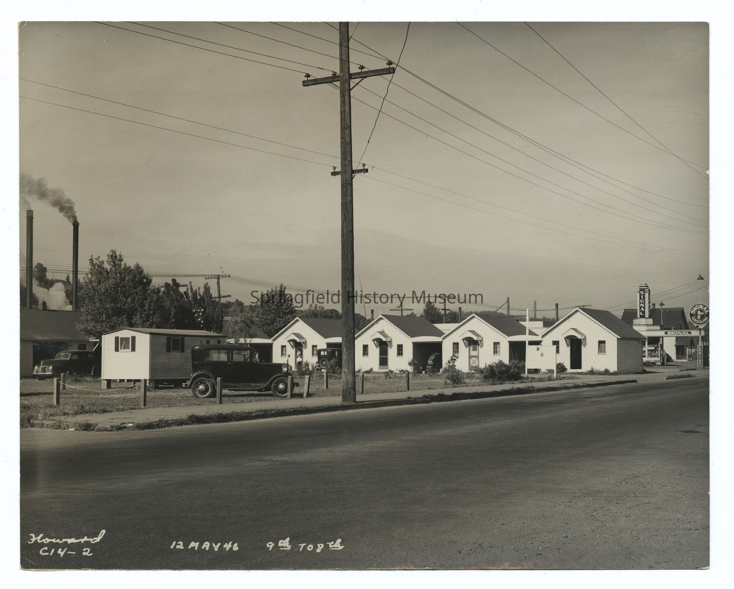 Photograph of Main Street, 9th to 8th, Springfield, May 12th 1946. Shows: Cottage court housing with four uniform small houses, Signal GasolinePhotograph Details