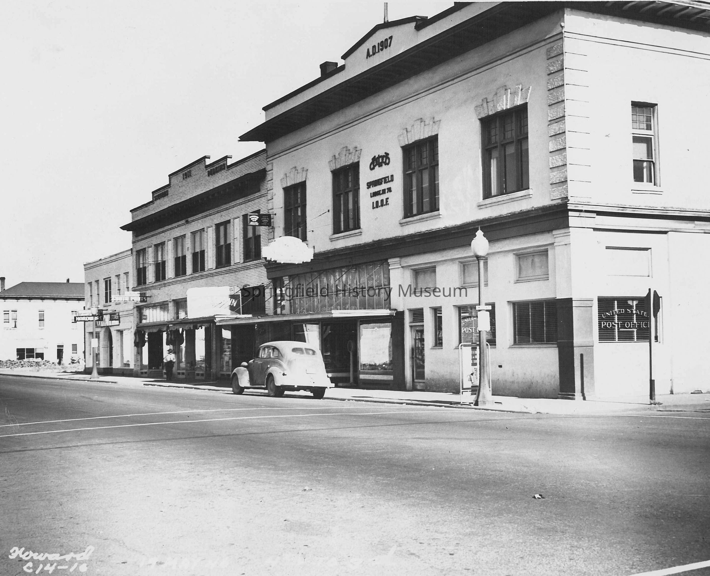 Buildings, Street Views, Main Street, 3rd Street, 4th Street, I.O.O.F. Building, Odd Fellows Building, Stevens Building, Hardware Store, Cars, Automobiles, Street Views, Springfield--Streets--Main Street, Buildings--Odd Fellows Building, Buildings--I.O.O.F. Building, Buildings--Stevens Building, Springfield--Streets--3rd Street, Springfield--Streets--4th Street, Street Views--Springfield, Business & Industry--Hardware Store, Transportation--Motor Vehicles--Cars