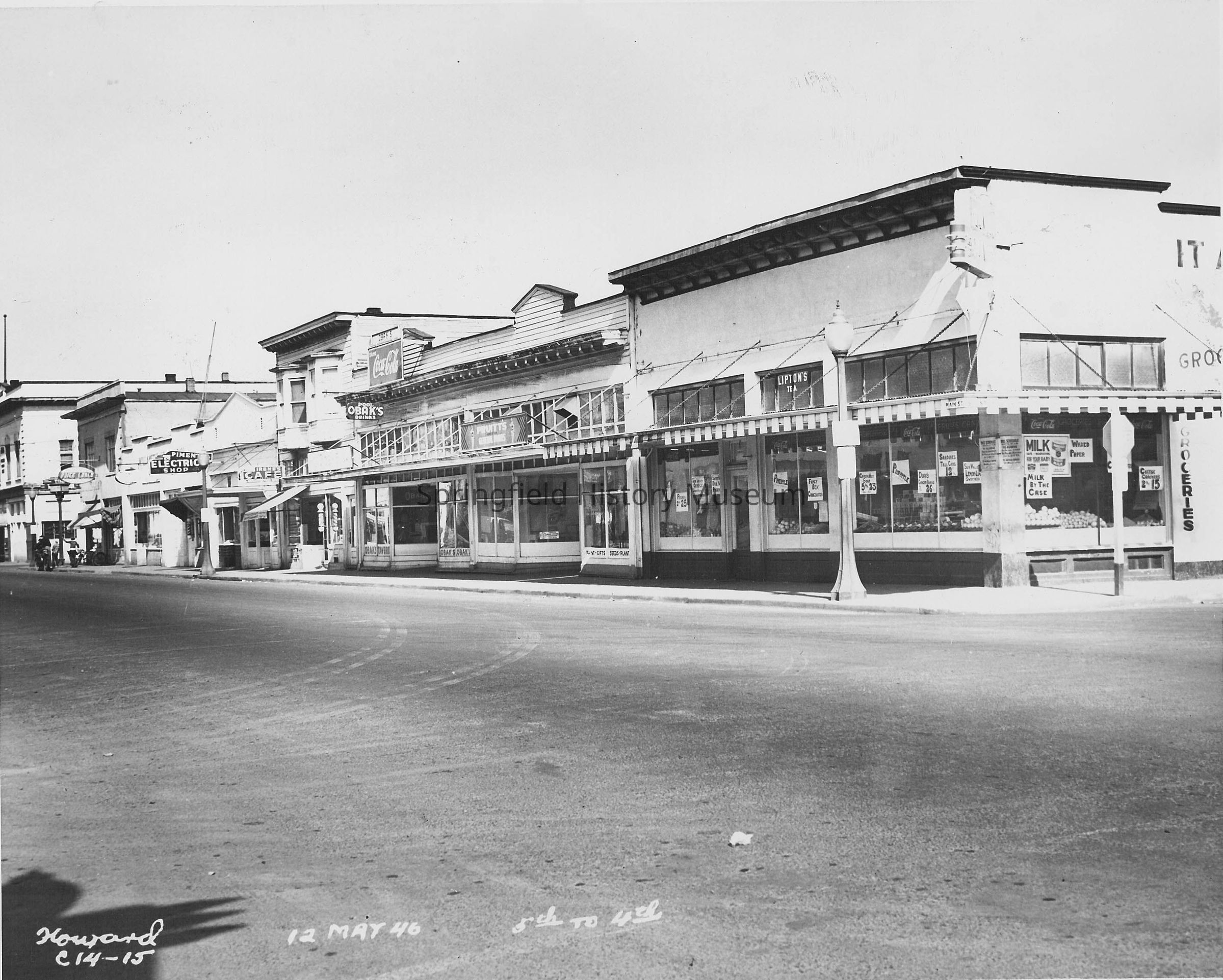 Business & Industry, Street Views, Pruitt's, Obak's, Irene's Cafe, Electric Shop, Grocery, Main Street, 4th Street, 5th Street, Street Views, Howard C14-15, Business & Industry--Pruitt's, Business & Industry--Obak's, Business & Industry--Restaurants & Cafes--Irene's Cafe, Business & Industry--Electric Shop, Springfield--Streets--Main Street, Springfield--Streets--4th Street, Springfield--Streets--5th Street, Street Views--Springfield
