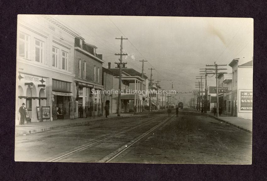 Main Street, Springfield OR; businesses and storefronts both sides of street; streetcar tracks, a few unnamed people. Business signs are for Springfield News, Independant theater, Hamptons, and Bell Theater. Street is paved and streetcar tracks are in place. After 1911.
