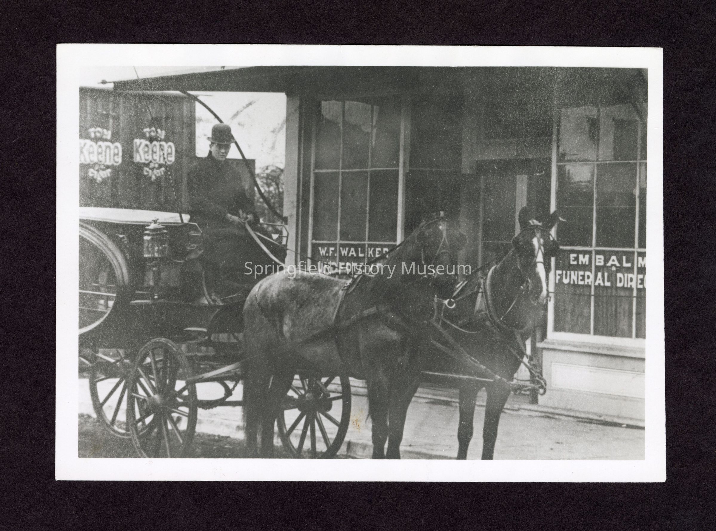 Black and white photo of man on horse drawn wagon in front of Tom Keen cigar shop. Funeral home in background. Donor's father Leland Davidson write "Springfield" on back of photograph