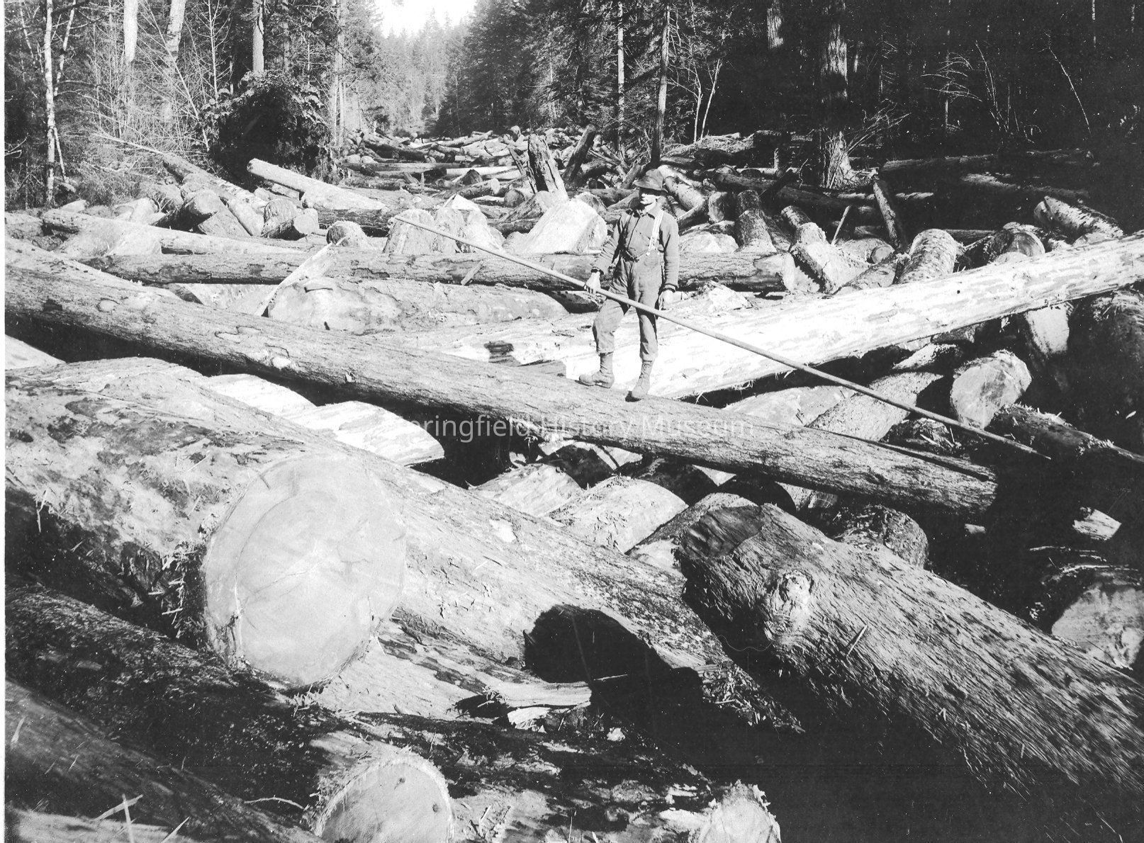 Photograph of solid log jam on the Willamette River, one man with a peavey standing on the logs in the dry riverbed, undated