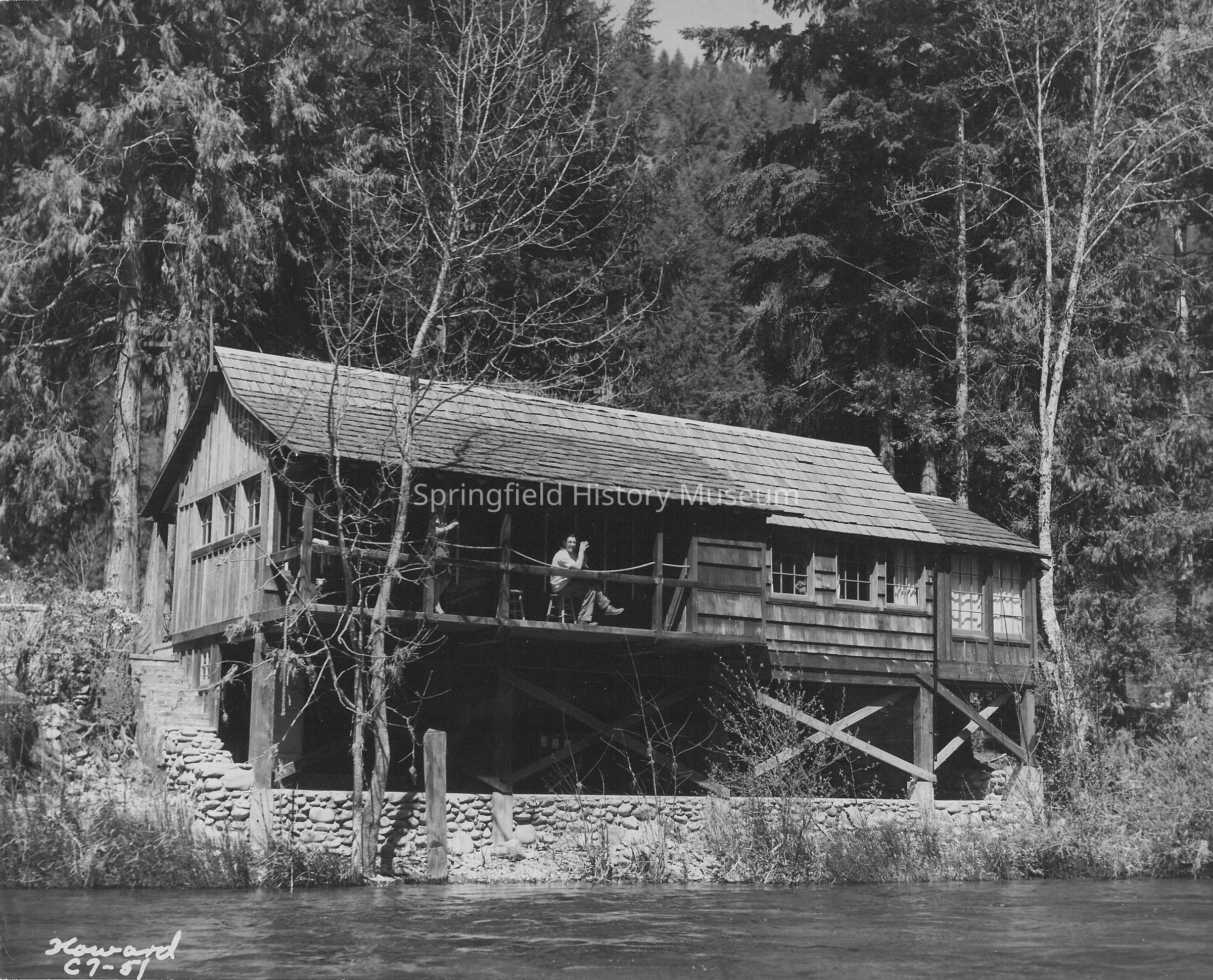 McKenzie river, White water parade, shingle sided home with man on porch. April 1946. Marked Howard C7-51