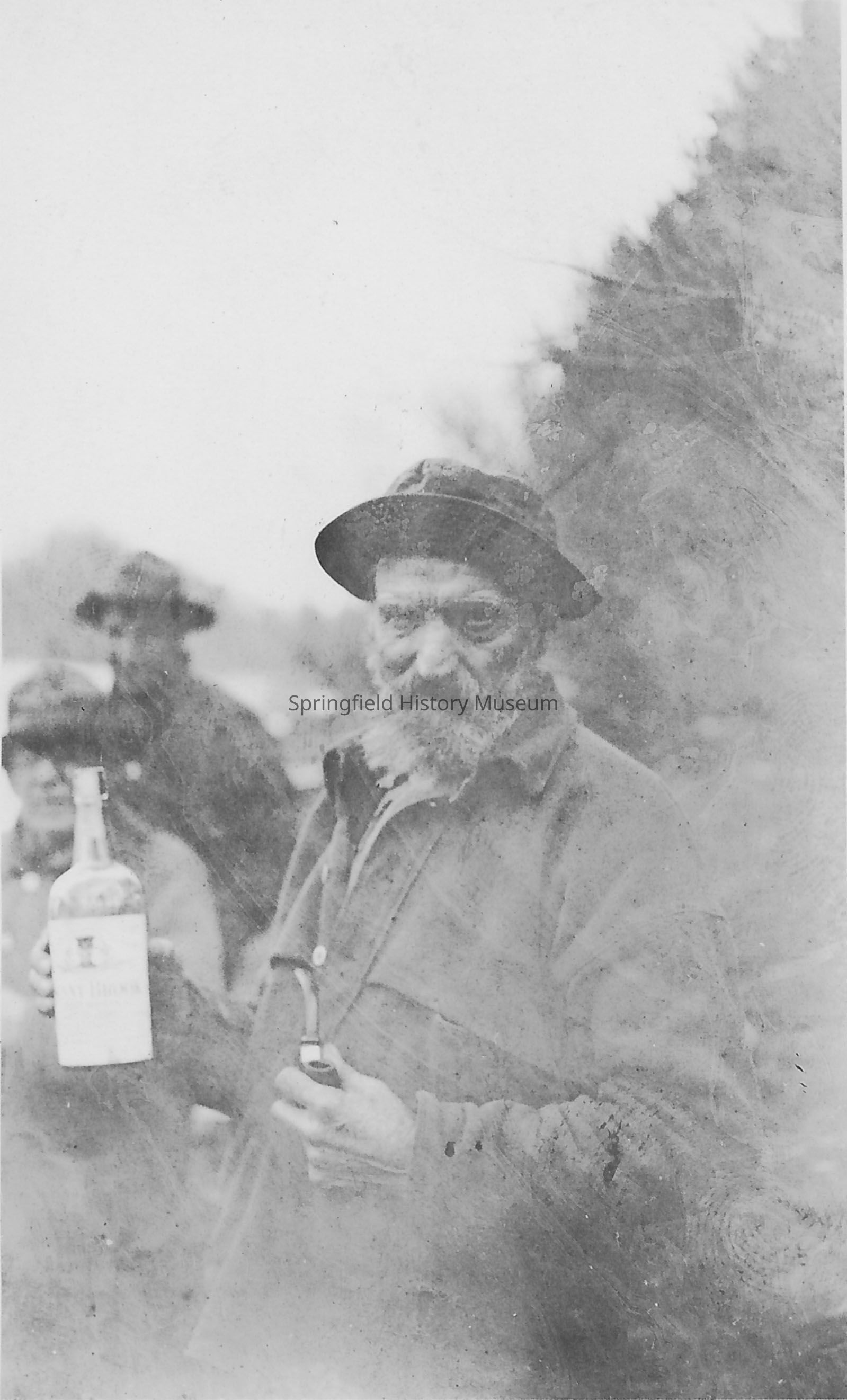 A bearded man, identified as Mat Emerich of Walterville, holding a pipe and a bottle. Written on back of the photo; "Mat Emerich - Walterville & J.W. Kelly- Prohibition days". No date, also a torn duplicate.