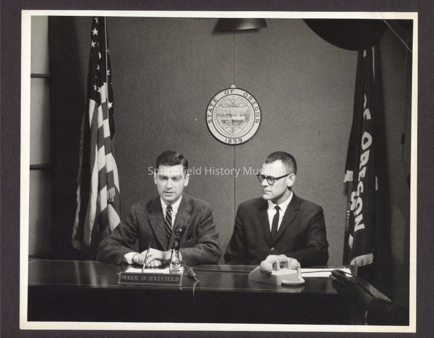 B&W Photo of Governor Mark O. Hatfield of Oregon and unknown man sitting behind a desk with the Oregon state seal behind them and the American and Oregon flags flanking them.