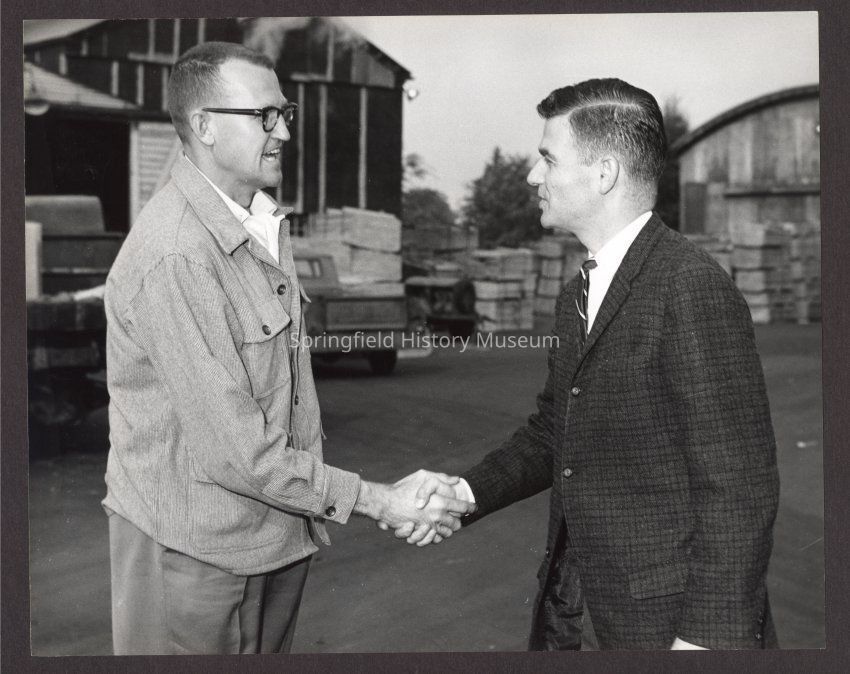 B&W photo of Mark O. Hatfield, Governor of Orego,n shaking hands with unknown man, outside lumber yard.