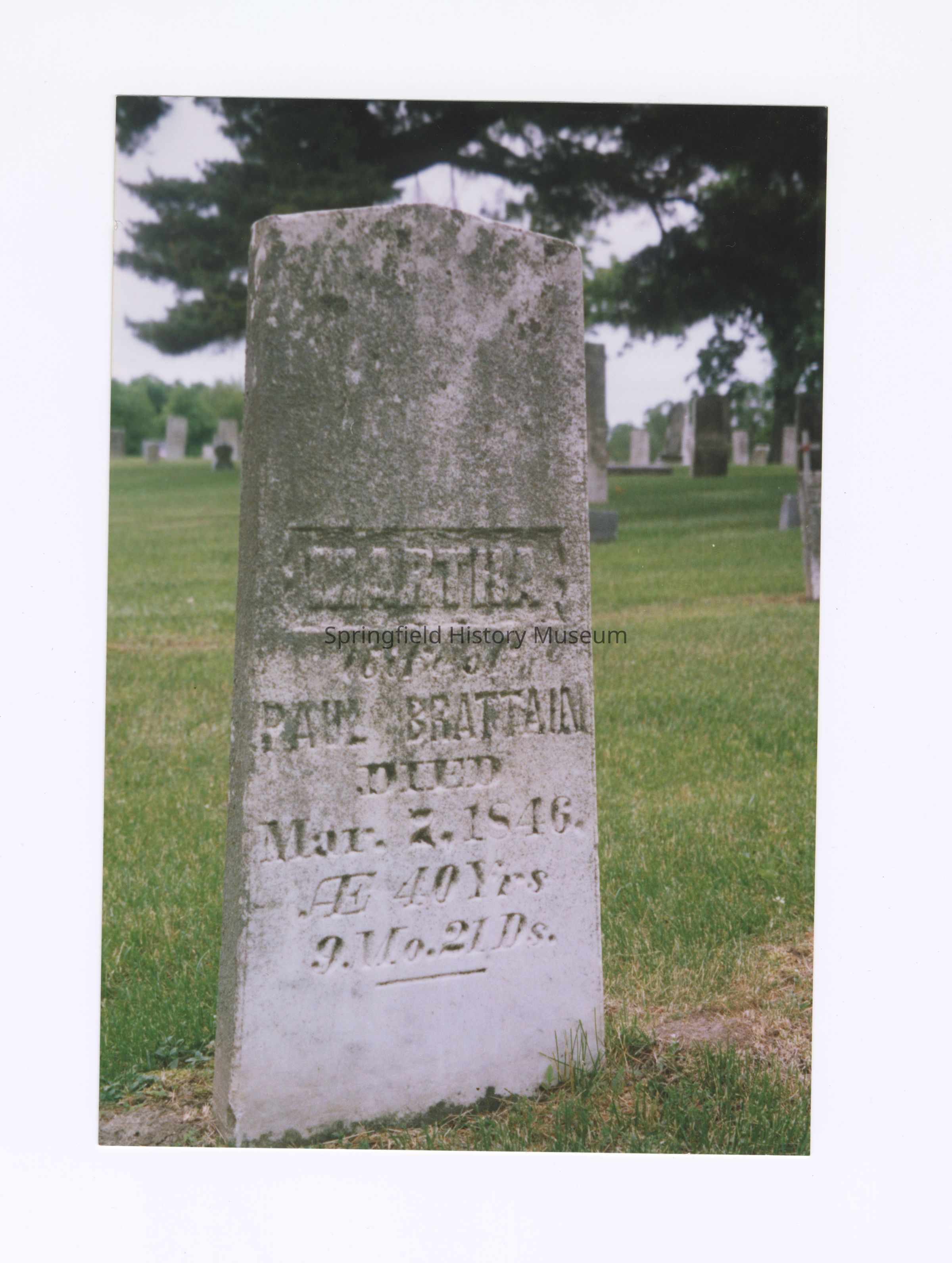 Photograph of Martha Brattain's headstone, Spencer Cemetry, Stockport, Iowa, undated. Martha Brattain, wife of Paul Brattain, died in Iowa in 1846.Photograph Details