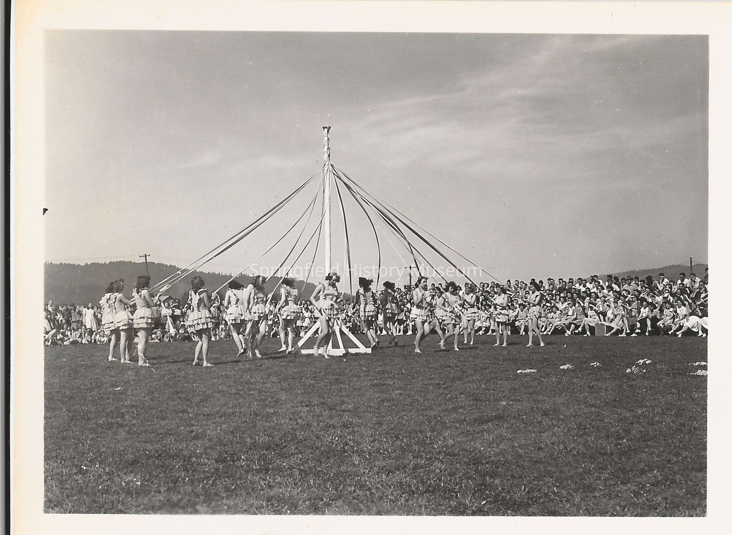 Photograph of Springfield High Mayday Festival circa 1945. Girls dance club festival outside in ball field. Large group around a maypole.Photograph Details