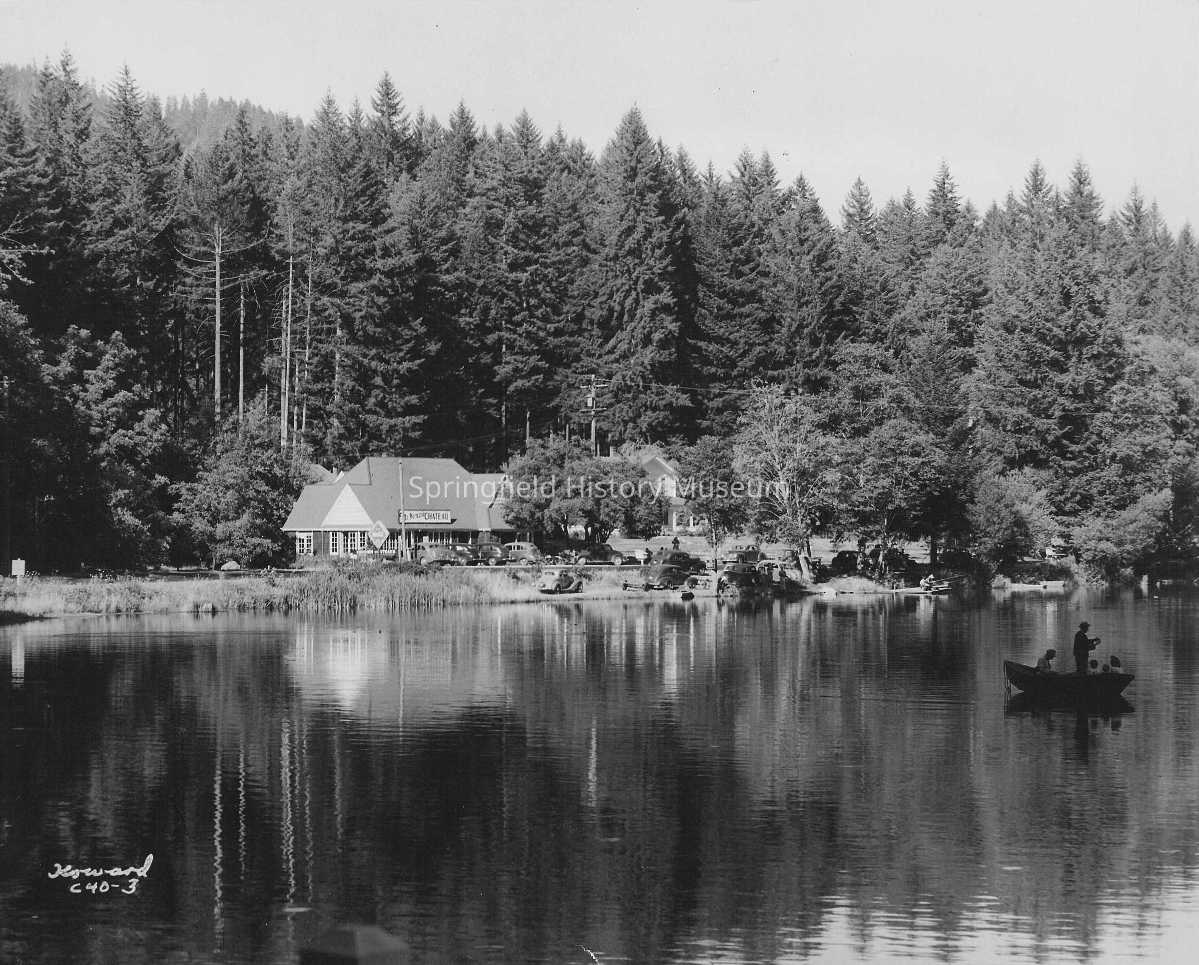 McKenzie Chateau on the river view. This is just east of Leaburg dam. Marked Howard C40-3. Boat on lake with two men, a woman and two children on far righ of photo. Dated about 1946.