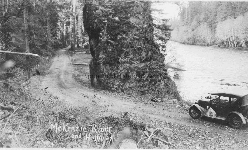 Photograph of the McKenzie River and highway. Shows a car, river and an unsurfaced road. Transcribed inscription on front: "McKenzie River and Highway