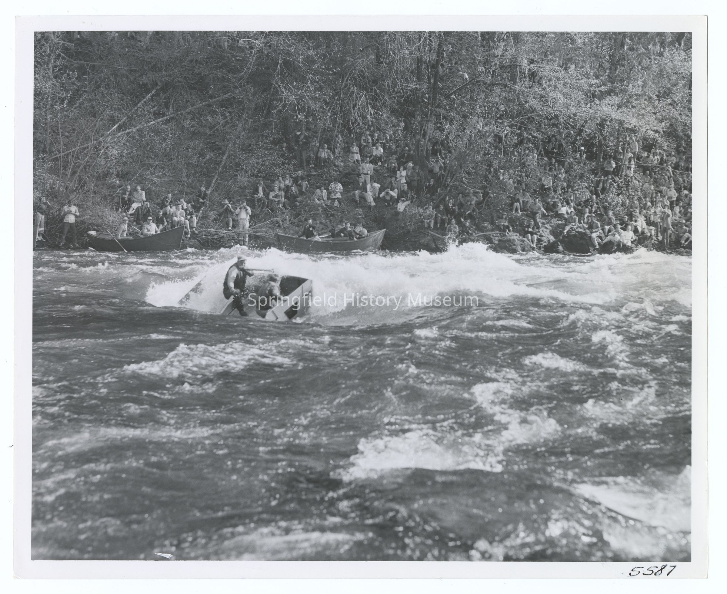 Inscription back: Shooting Martin Rapids during the McKenzie River White Water Parade in Oregon is one of the most thrilling parts of this annual event. Hundreds line the banks to watch the fun as scores of boats make their way through these heavy rapids. Some boats nearly upset during the shooting of the rapids, which are included in this annual event in which boats run the river from Redsides to Leaburg, the Sunday preceding the Oregon's trout season opening in April. Oregon State Highway Commission Photo # 5587Lexicon