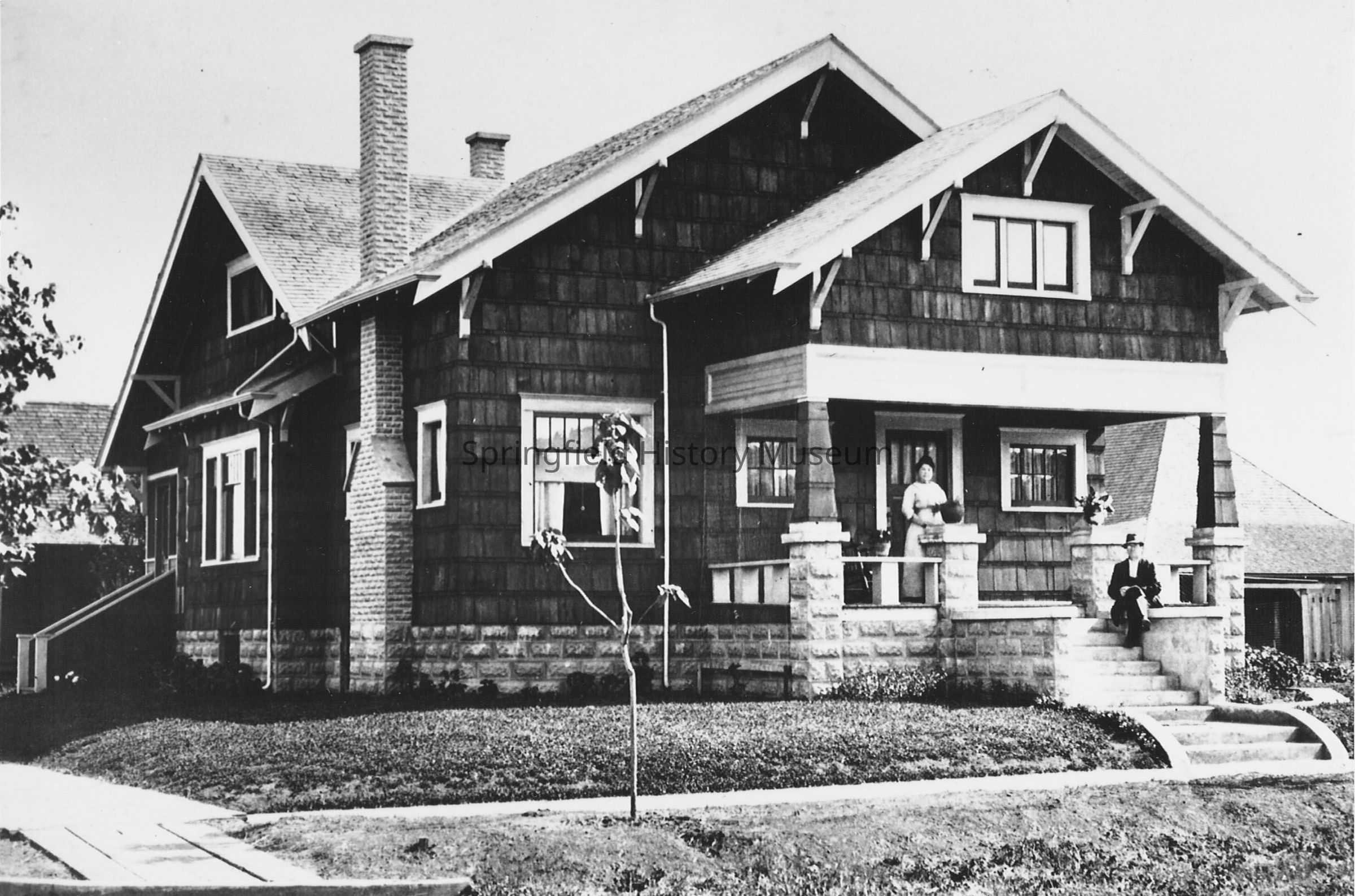 The McKlin house at 606 D Street in Springfield, currently owned by R. Schamber. Man and a woman are on the front porch, no date, donated from the Lane County Museum.