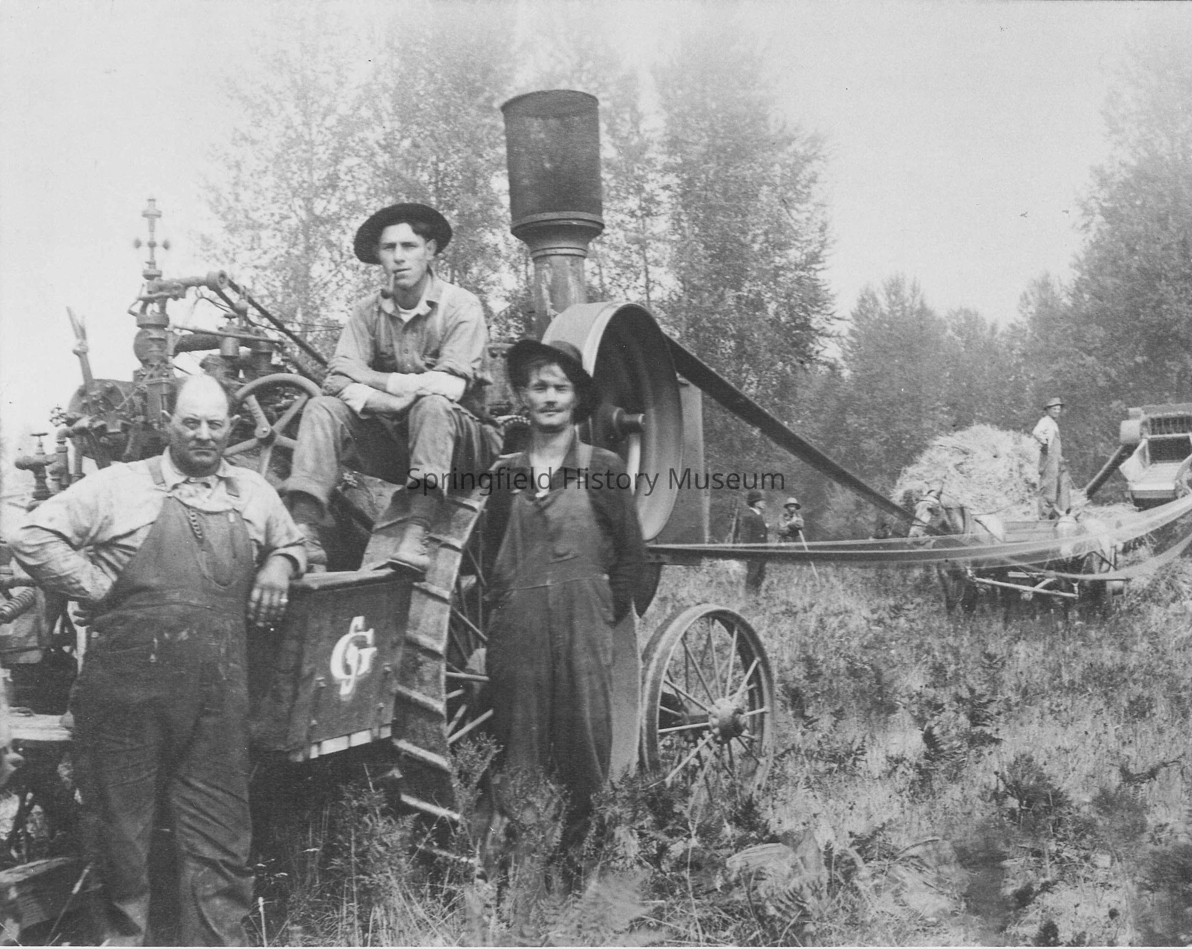 Photograph of a group of three men, Bud McPherson, Frank Edmiston, and John Edmiston. McPherson baling and threshing crews of Springfield went all over the county. UndatedCollection