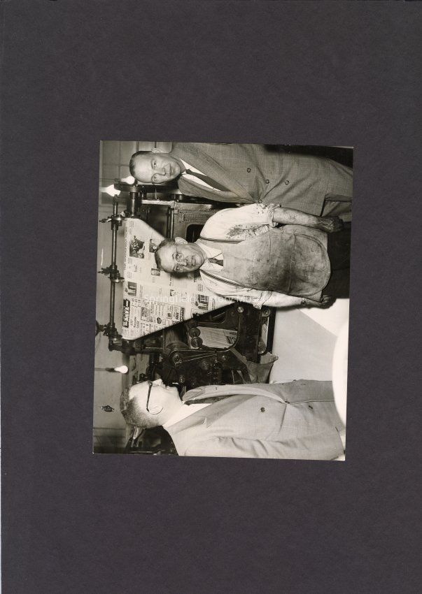 B&W Photo of 3 men in the printing room of the Springfield, Oregon News next to Printing Press.Collection