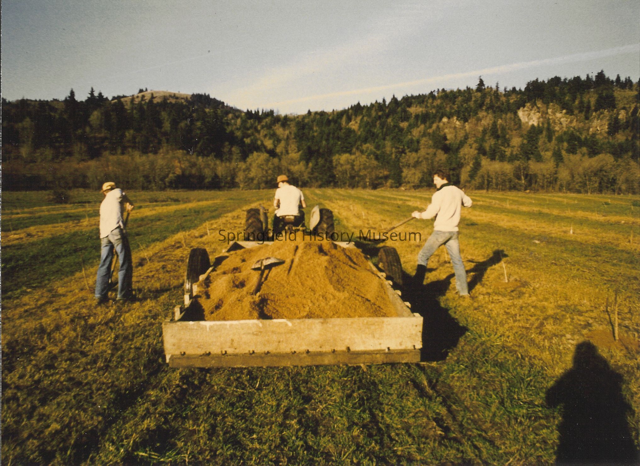 Trailer full of some substance being spread on a field by two men; another man driving tractor. 1996. Seavey farm.