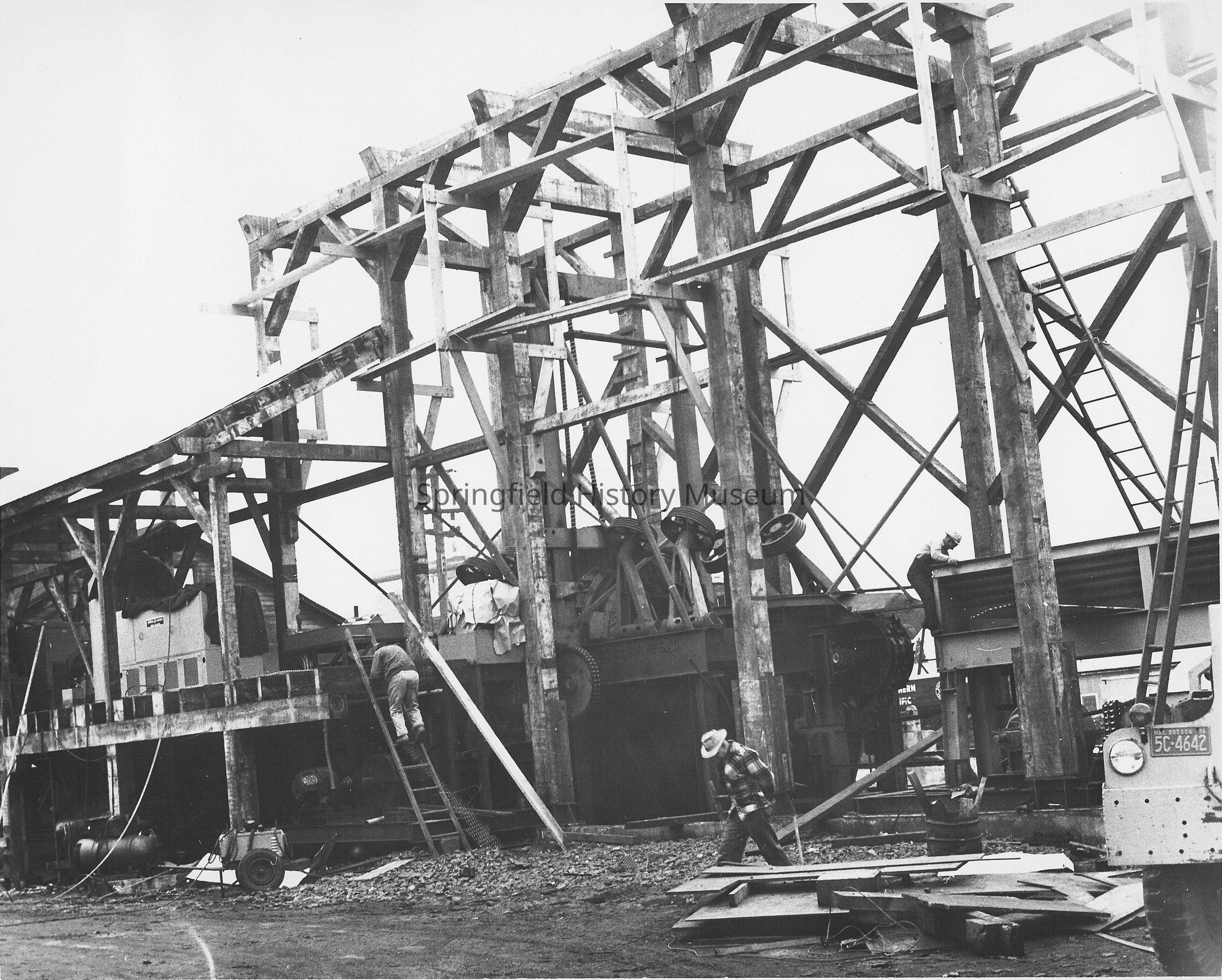 Men working on the barker building at the Booth-Kelly mill during the renovations of 1956.
