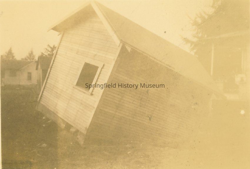 Photograph of Merril's Garage Tipped Over by Flood Water, Glenwood, OR, 1927Entry/Object ID