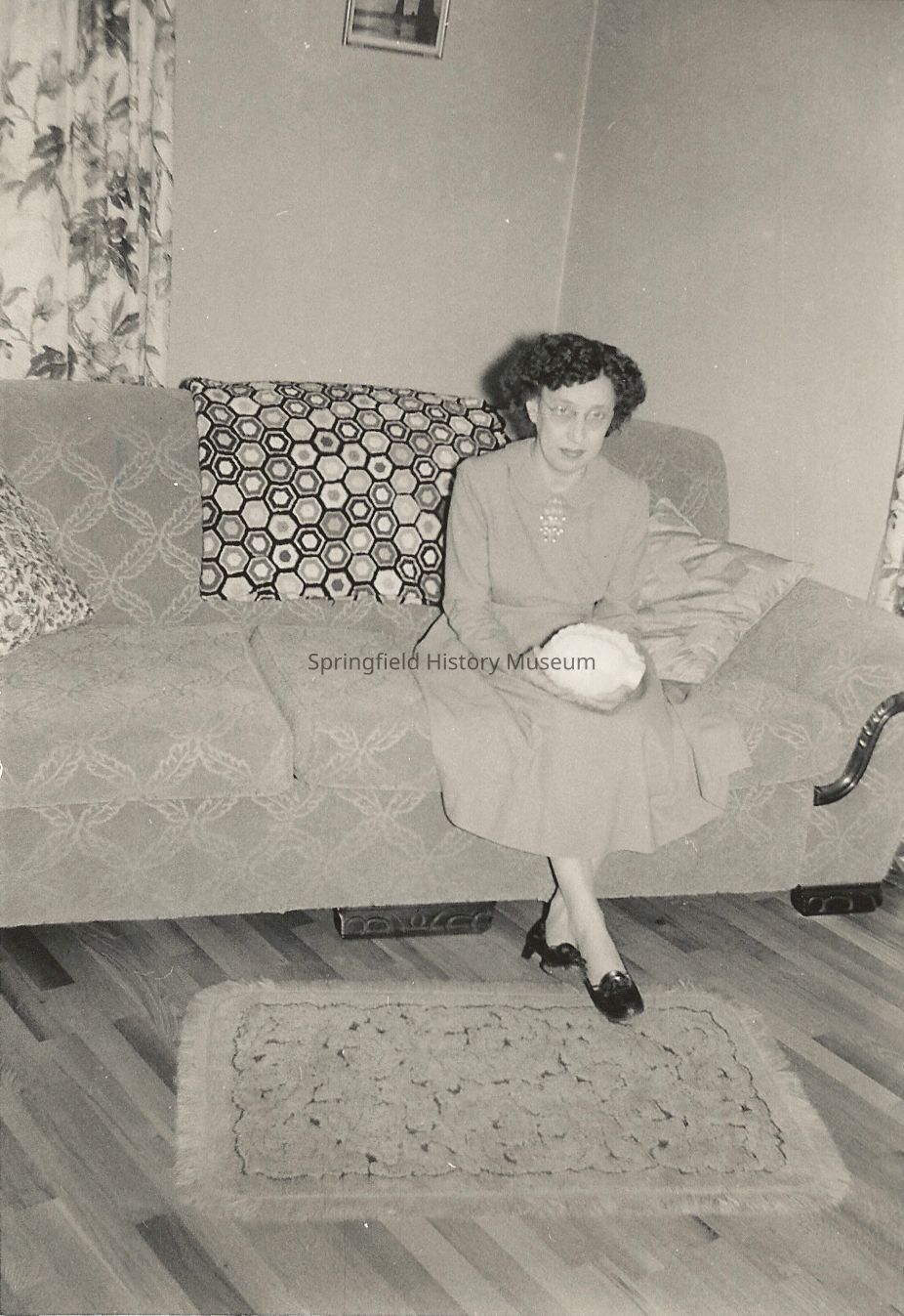 Mildred Vitus seated on couch holding a large seashell on her lap. Taken about 1948 to 1950.Collection