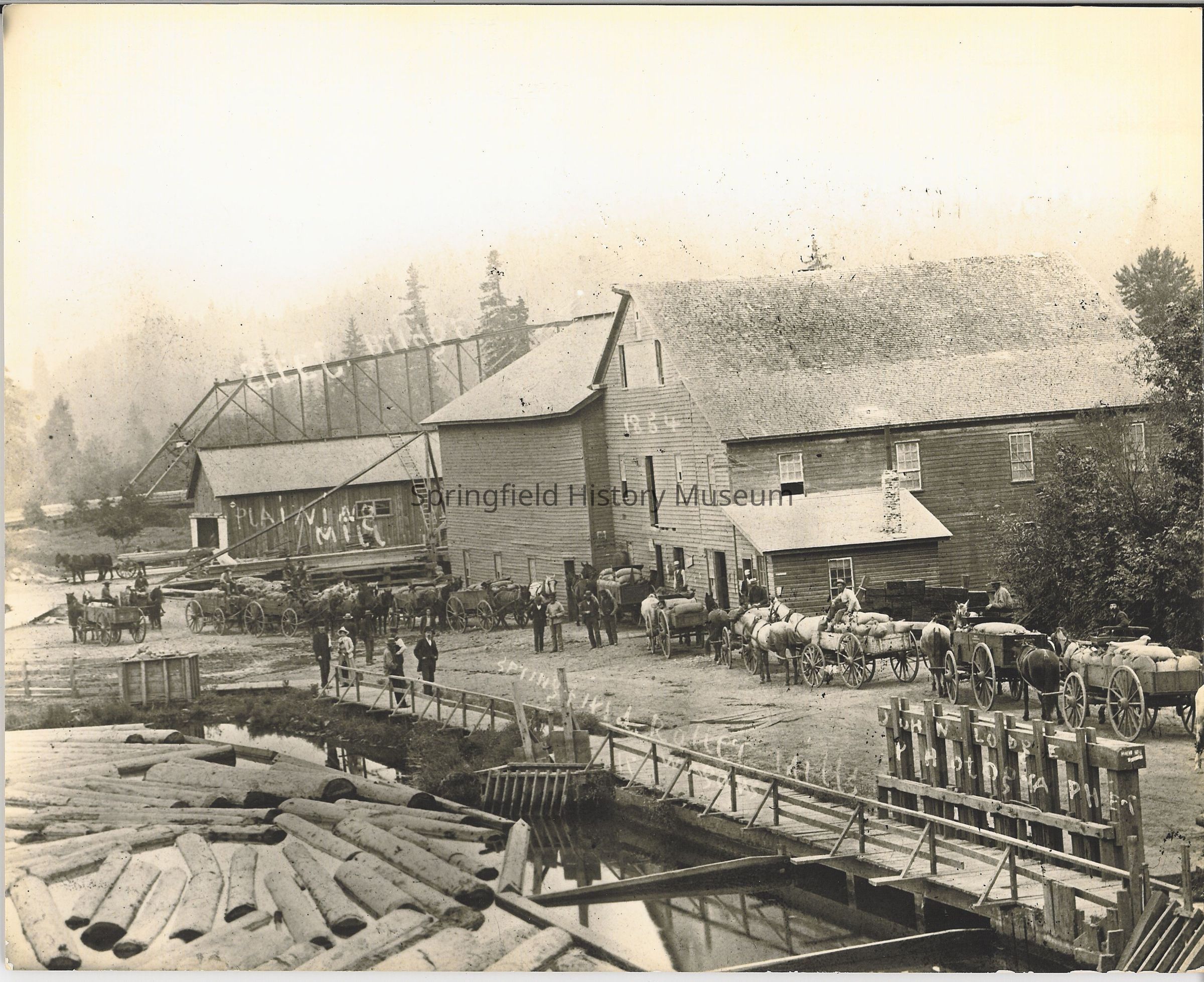 Mills on the millrace; Planer Mill, Flouring Mill (Roller Mill). Shows the Steel Bridge (wagon bridge) in the background, foot bridge across the millrace and men with horse drawn wagons. No date but the Flour mill was built in 1854.