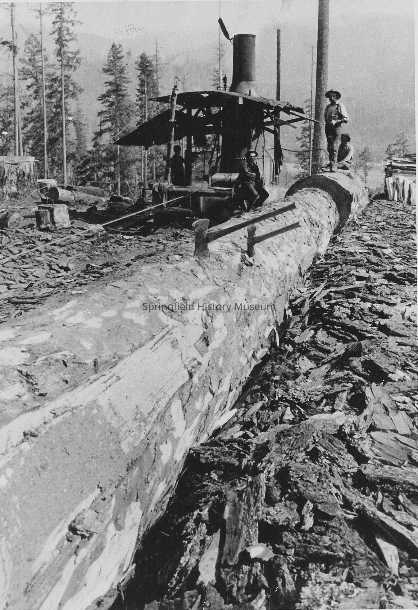 Logging, Montgomery Brothers, Log Haul Road, Engine, Crew, Loggers, Steam/Gasoline Donkeys, McKenzie Region, McKenzie River, Axes, McKenzie Region--Geographical Features--McKenzie River, Waterways--McKenzie River, Logging--Camps--Montgomery Brothers Camp, Logging--Equipment--Steam/Gasoline Donkeys, Logging--Personnel, People--Groups & Individuals