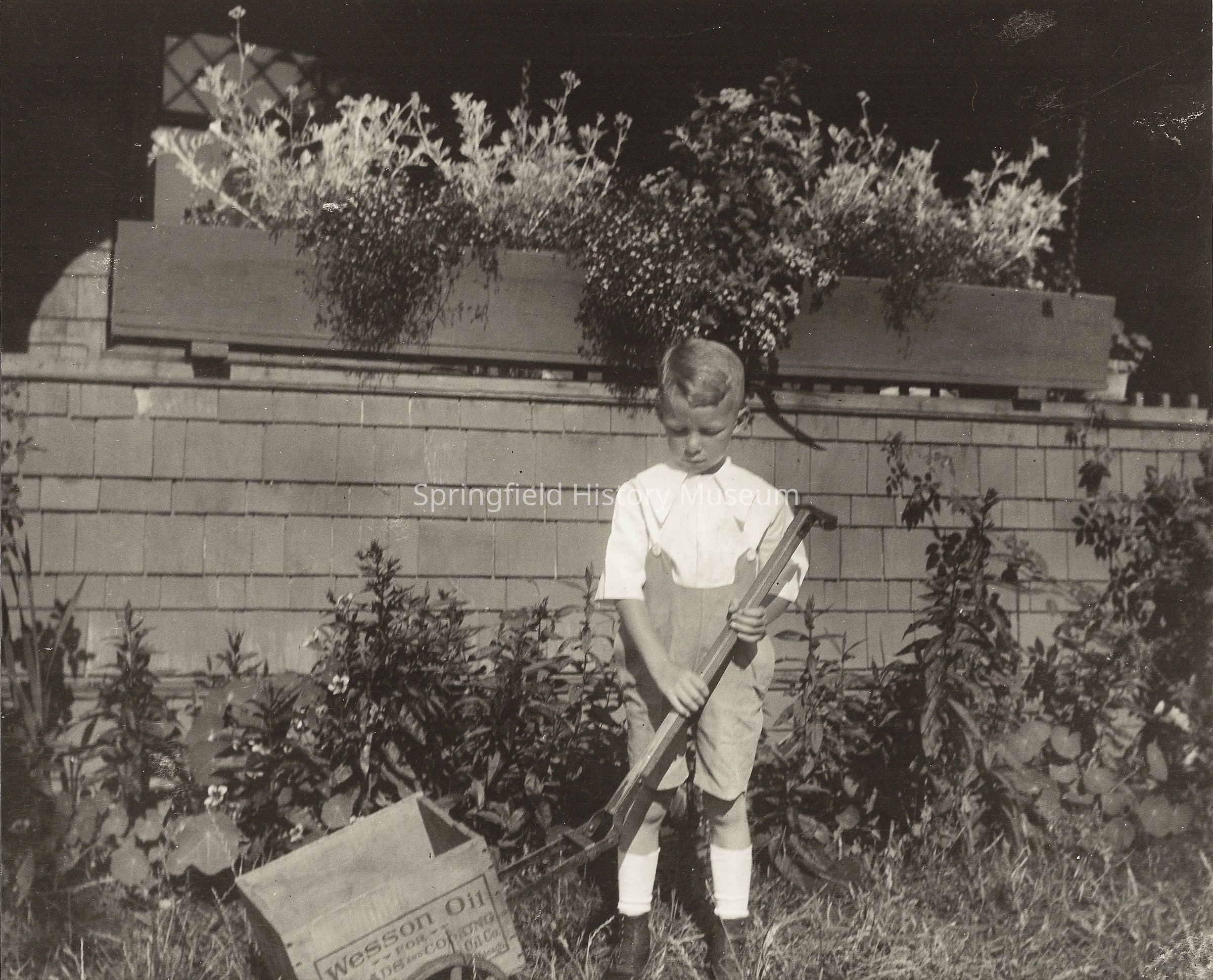 Morrie Stewart with a home made wagon from a Wesson oil crate. Standing under a window box.