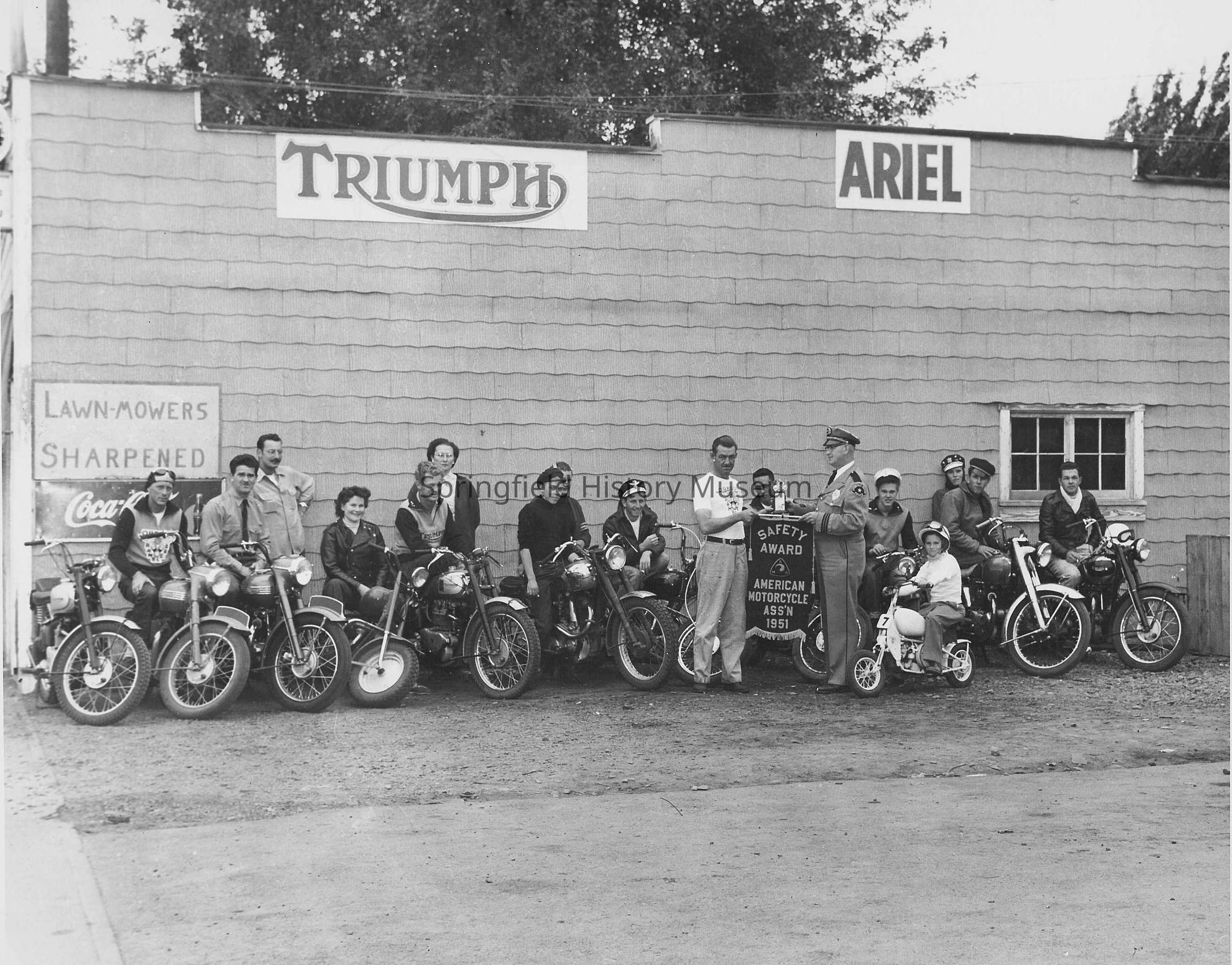 People, Transportation, Safety Award, American Motorcycle Association, Motorcycles, Motorbikes, Ceremony, Event, Triumph, Ariel, Lawn-mowers Sharpened, Coca Cola, Clubs & Organizations--American Motorcycle Association, Transportation--Motor Vehicles--Motorcycles, People--Groups & Individuals, Events & Activities--Ceremony
