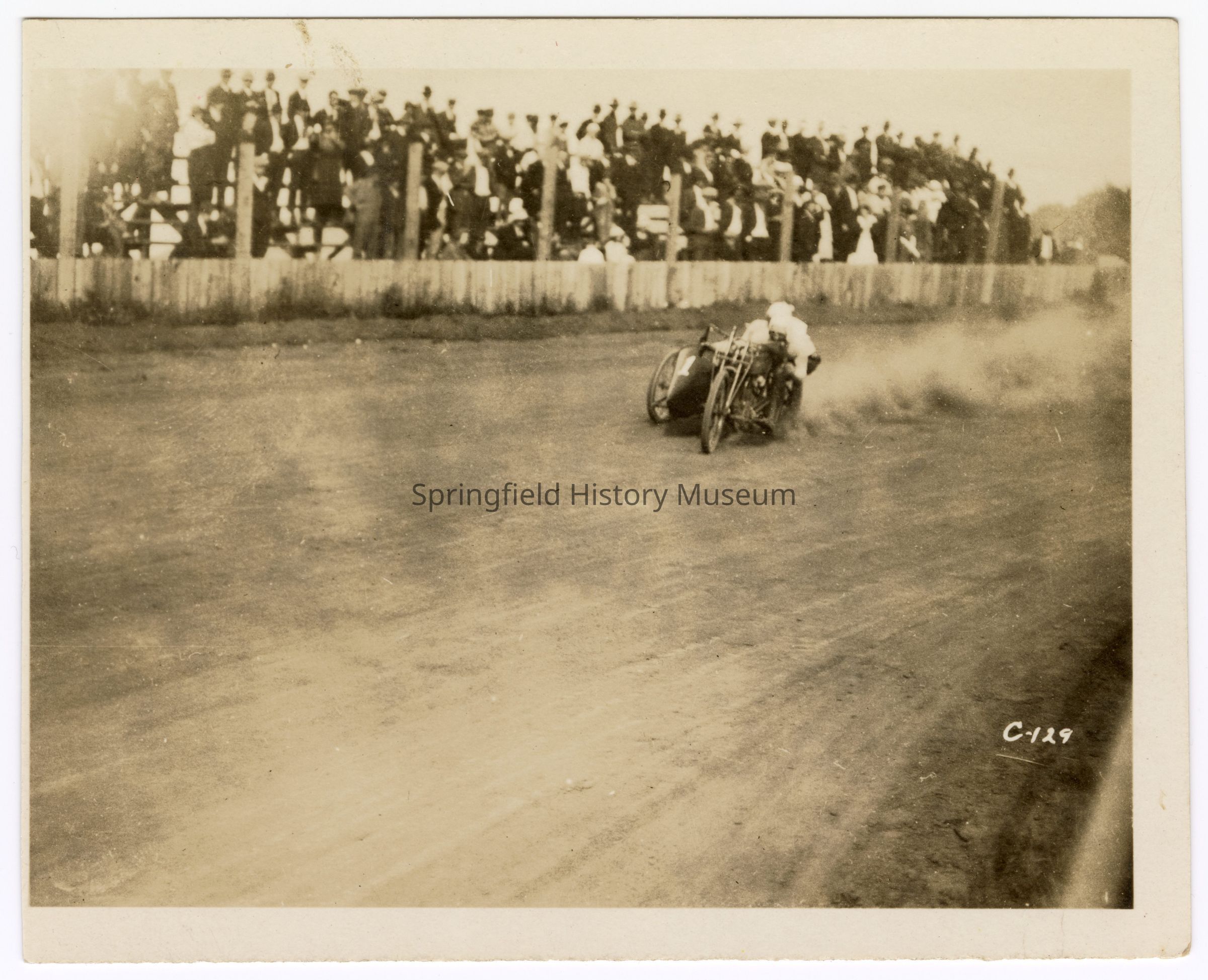 Photograph of motorcyclist Bill Davis senior and speed clerk on a speedway, undatedEntry/Object ID