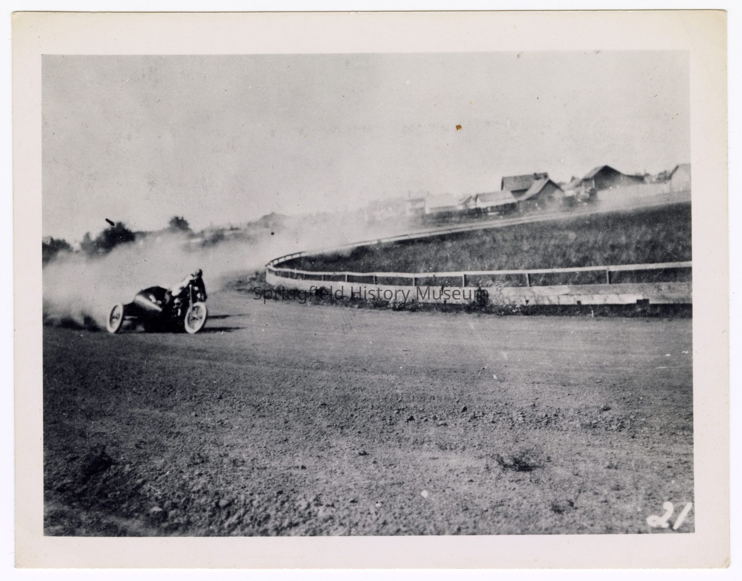 Photograph of motorcyclist Bill Davis senior on a speedway, undated; Inscription front: ‘21’, Back: ‘Bill Davis senior” “201”Lexicon