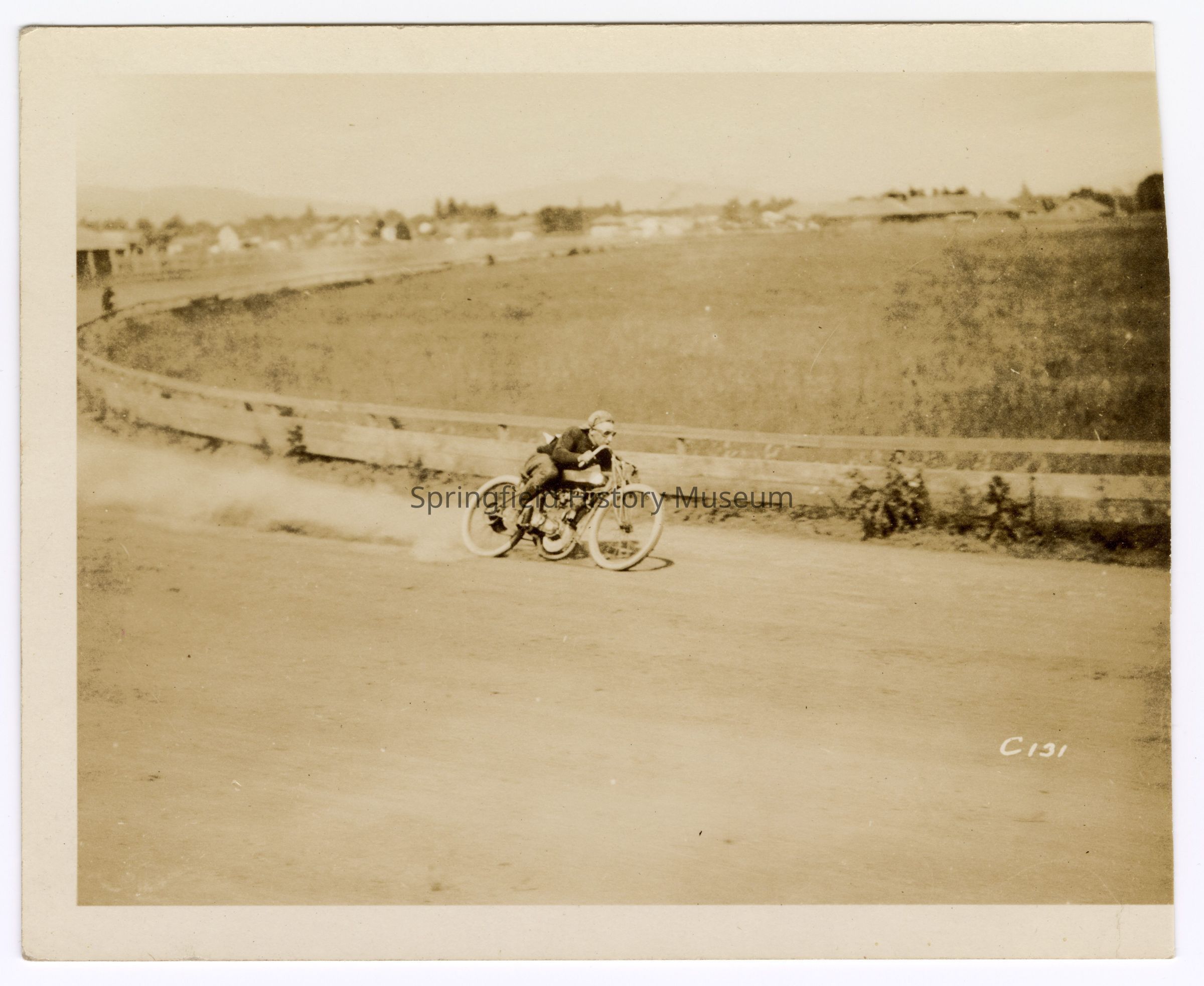 Photograph of motorcyclist Bill Davis senior on a speedway, undated; Inscription front: ‘C131’, Back: ‘Bill Davis’Lexicon