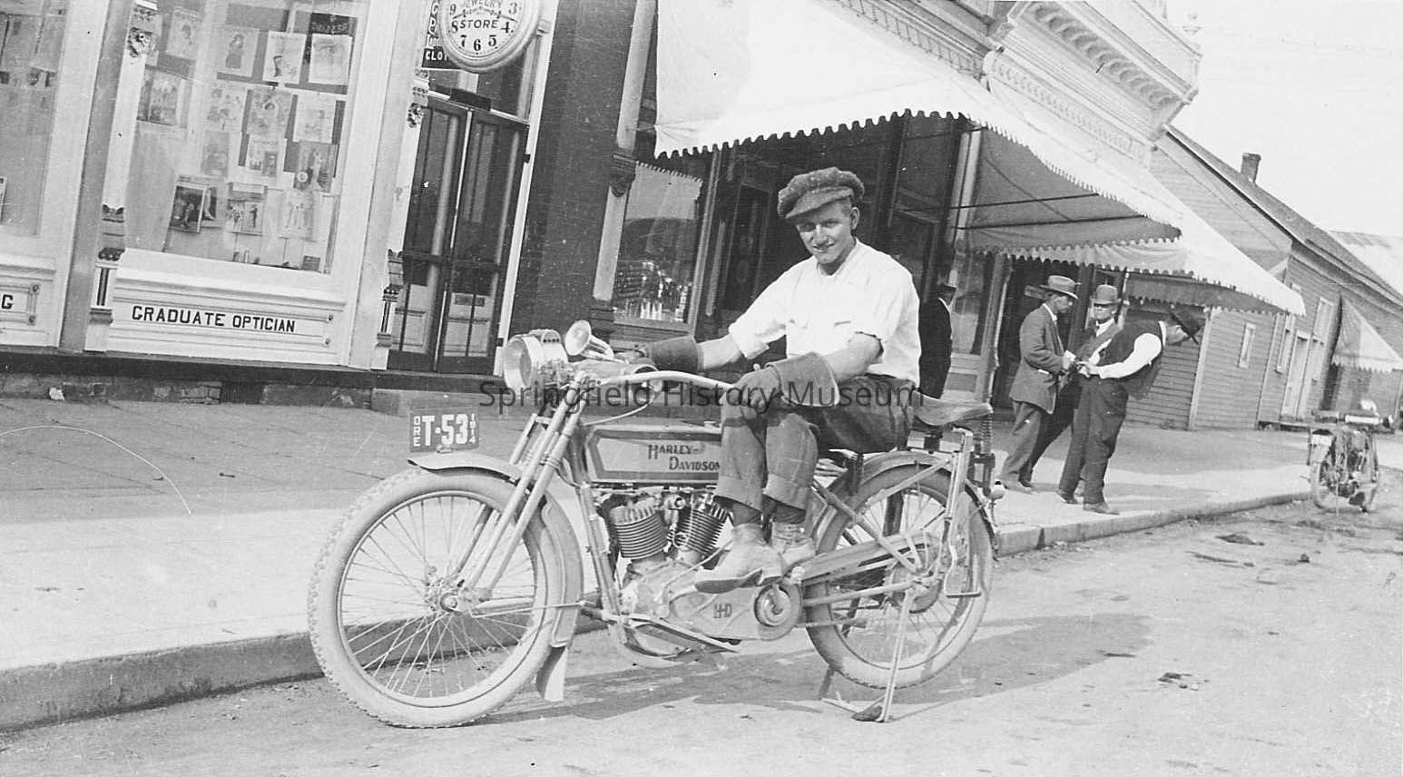 People, Transportation, Motorcycles, Motorbikes, Harley Davidson, Street Views, Jewelry Store, Graduate Optician, Ore T-53 1914, Transportation--Motor Vehicles--Motorcycles, People--Groups & Individuals, Business & Industry--Jewelry Store