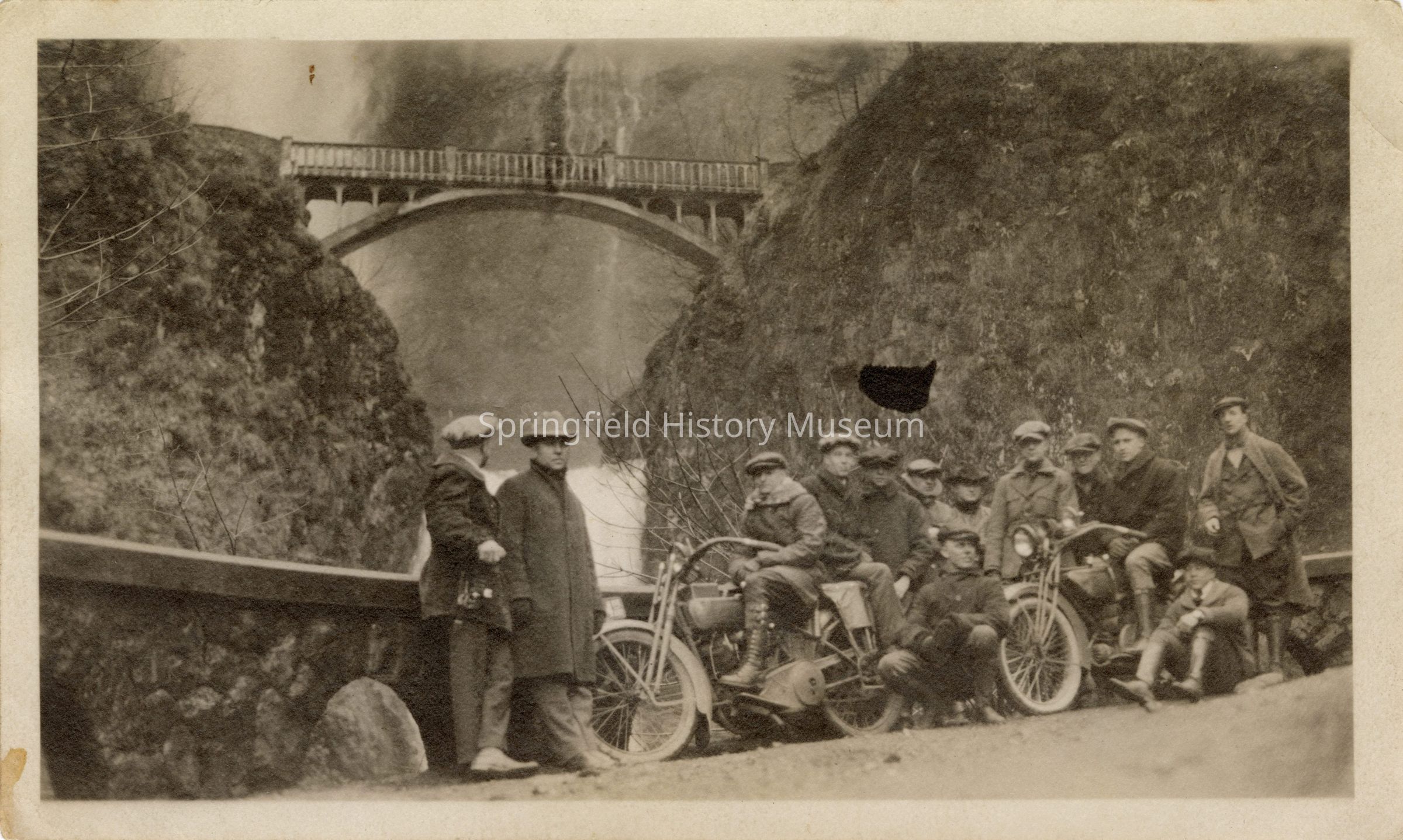 Photograph of motorcyclists in front of Multnomah Falls, undated