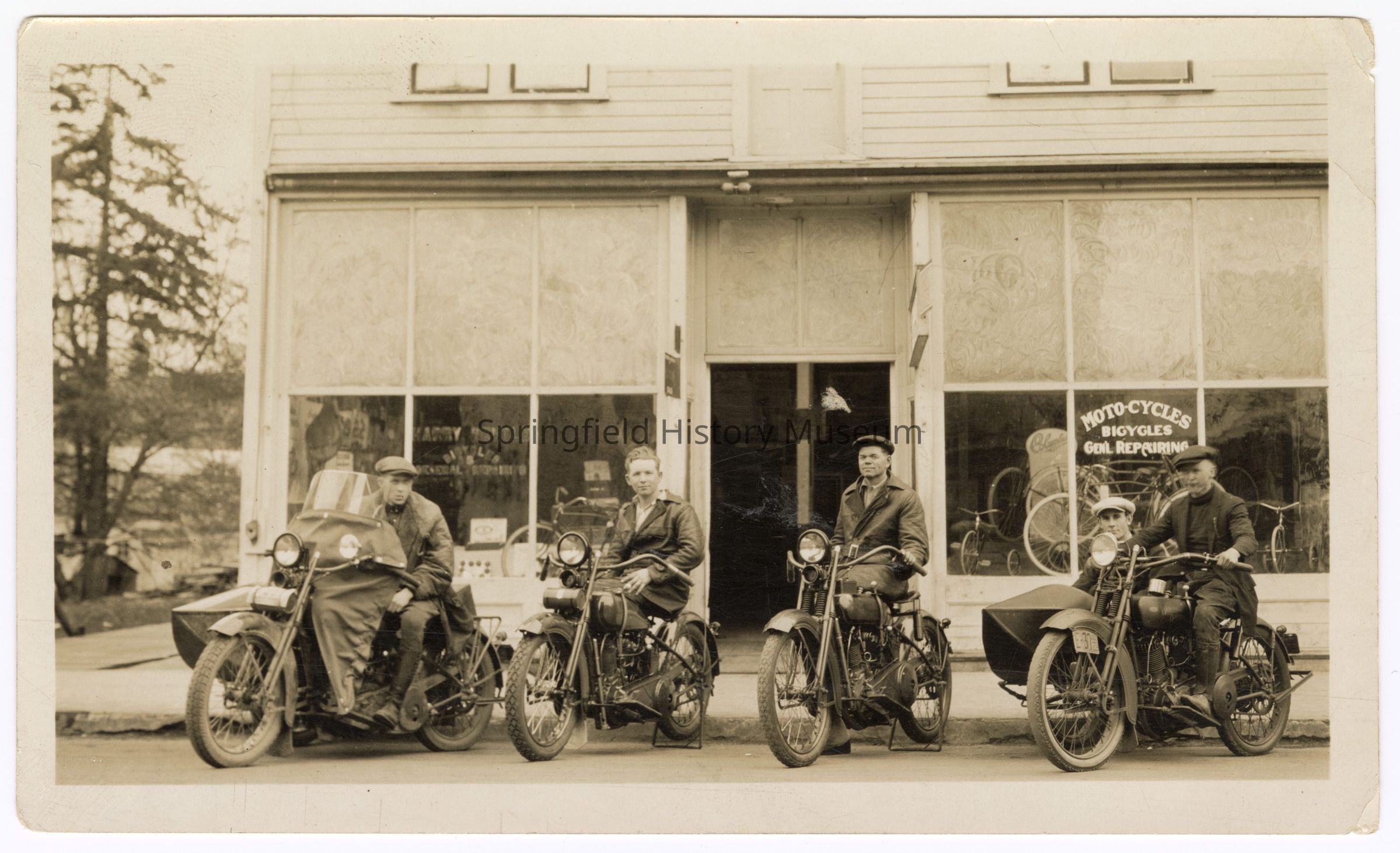 Photograph of motorcyclists posing in front of Harry [...] Bicycles Moto-Cycles shop, undated
