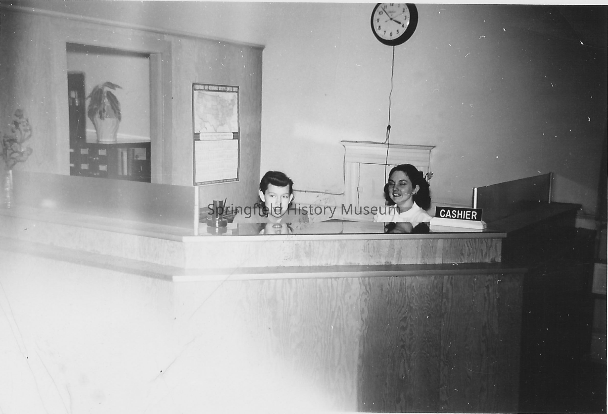 Two women, identified as Pat Bounds and Louise Peterson; cashiers, sitting behind desk in the offices of the Mountain States Power Company in Springfield; 1949.