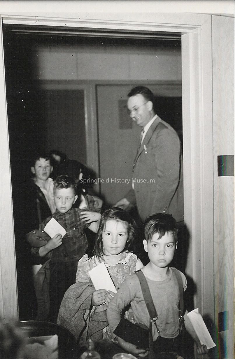 Photograph of Springfield High School Principal Mr. Sabin, escorting small children into classroom.Photograph Details
