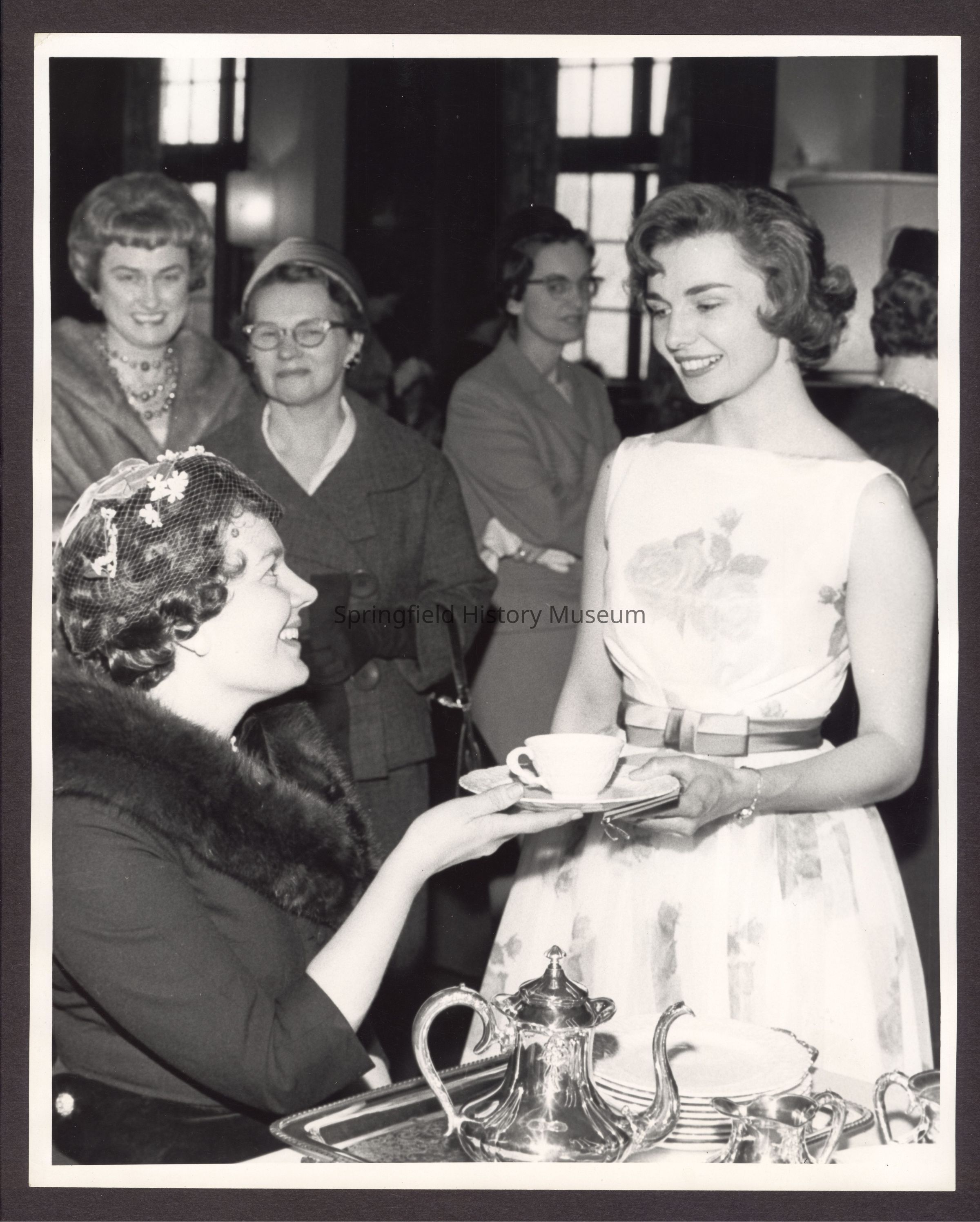 Photograph of Mrs. Mark Hatfield serving tea to unknown young lady. Date unknown.Entry/Object ID