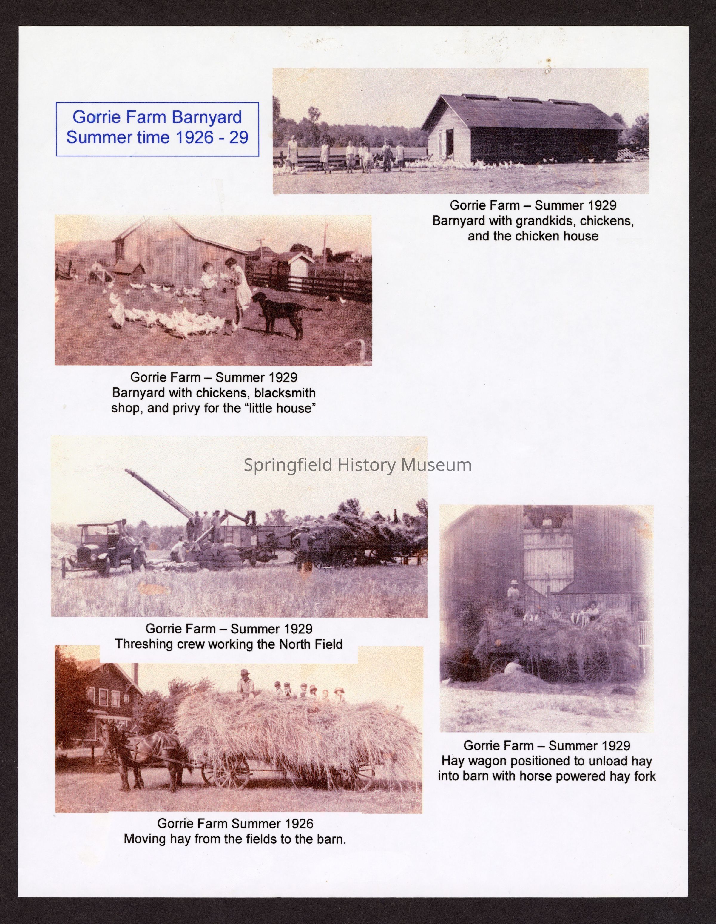 5 photos of Gorrie Farm Barnyard, Summer Time 1926-1929, printed on one sheet of paper with typed descriptions. On reverse of one copy, badly printed copy of 2012.026.055.