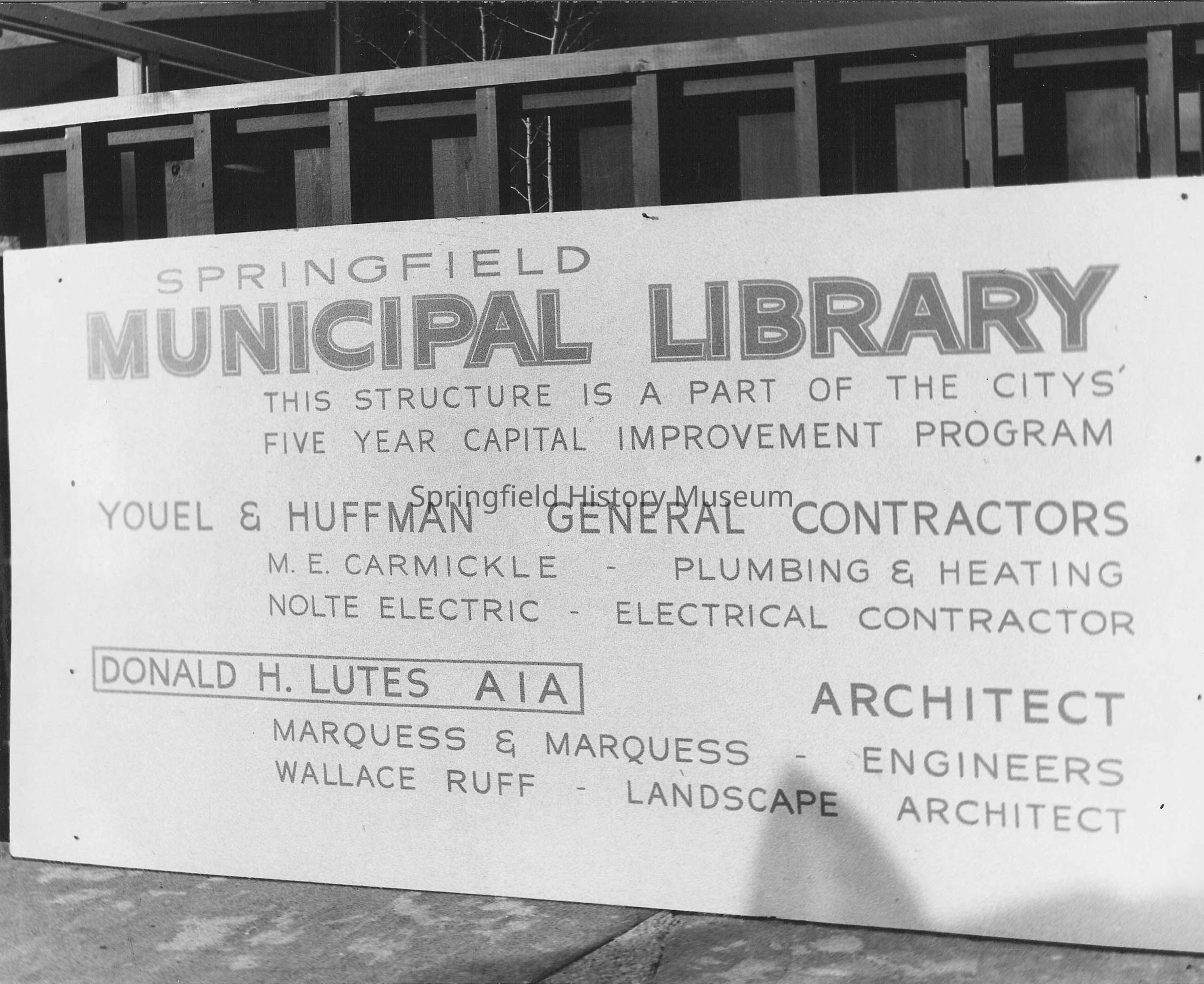 Photograph of construction sign on sidewalk reads: Springfield Municipal Library, This Structure is a part of the city's five year capitol improvement program. Youel & Huffman General Contractors; M E Carmickle, plumbing and heating; Nolte Electric, electrical contractor. Donald H Lutes AIA, architect; Marquess & Marquess, engineers; Wallace Ruff, Landscape architect.Photograph Details