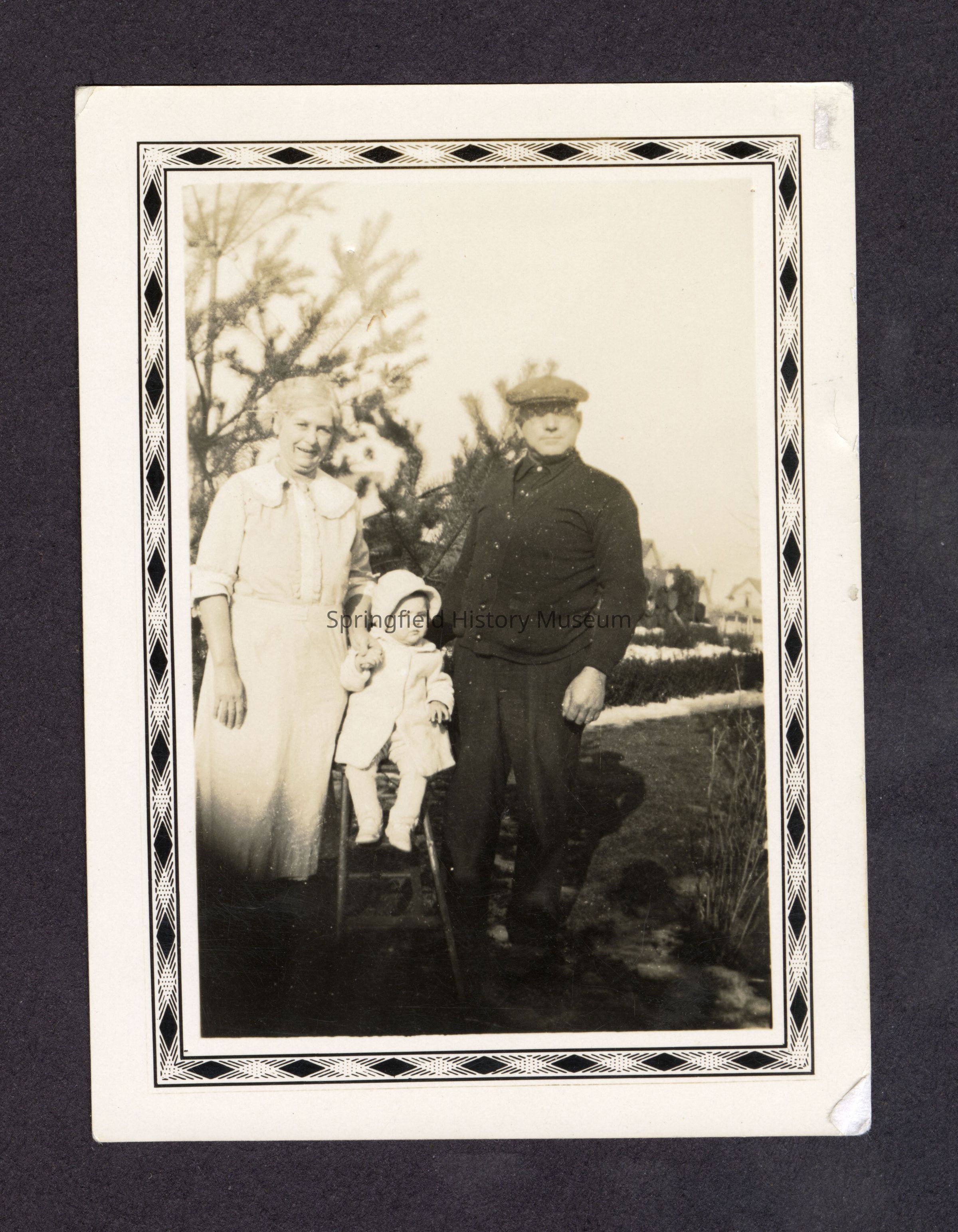 Photograph of a woman and a man with baby Myrna Myers between them, standing in front of a tree. Written on back, "1935 Fannie + Lina, Myrna."Dimensions