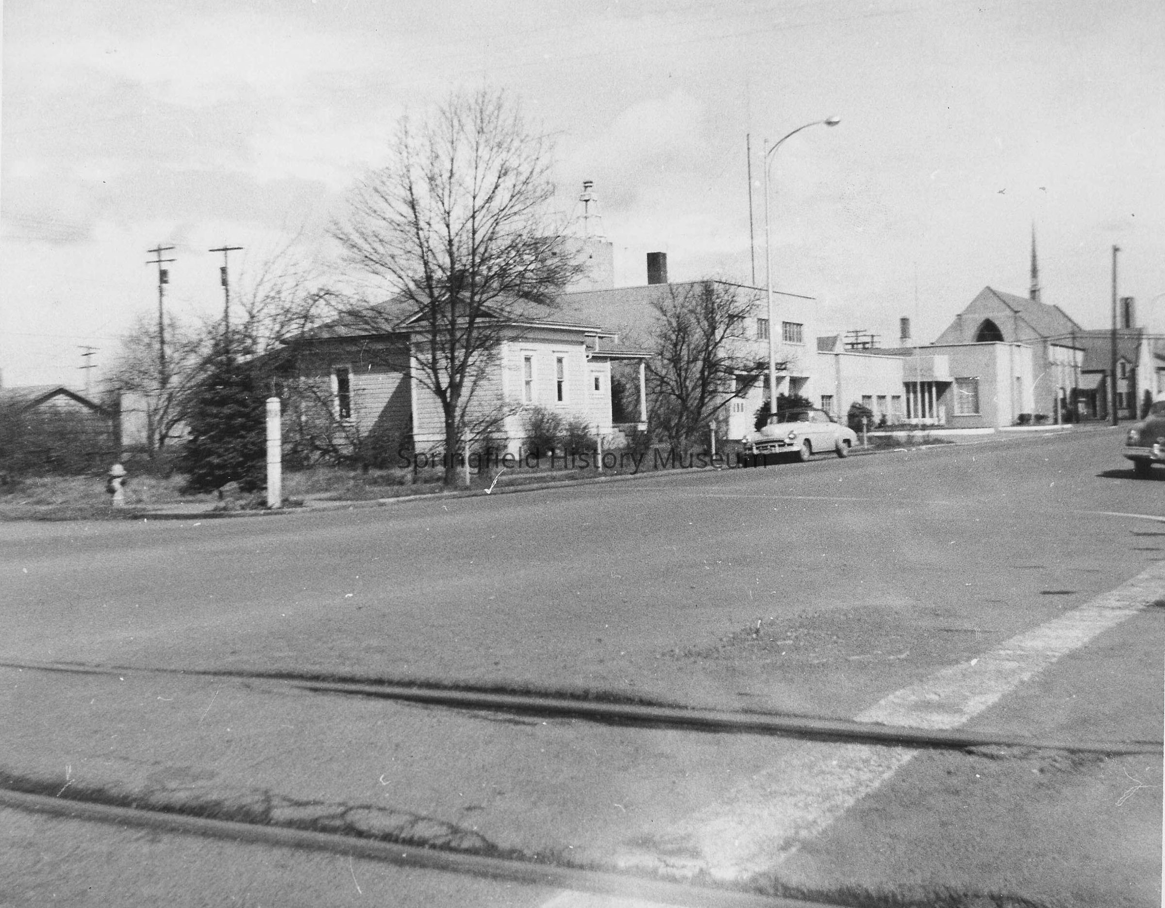 Buildings, Street Views, Springfield Public Library, Springfield City Hall, A Street, 3rd Street, Pioneer Parkway, First Christian Church, Street Views, Railroad Tracks, Cars, Automobiles, Springfield--Streets--A Street, Springfield--Streets--3rd Street, Springfield--Streets--Pioneer Parkway, Government--Buildings--Springfield City Hall, Buildings--First Christian Church, Buildings--Springfield Public Library, Street Views--Springfield, Transportation--Motor Vehicles--Cars