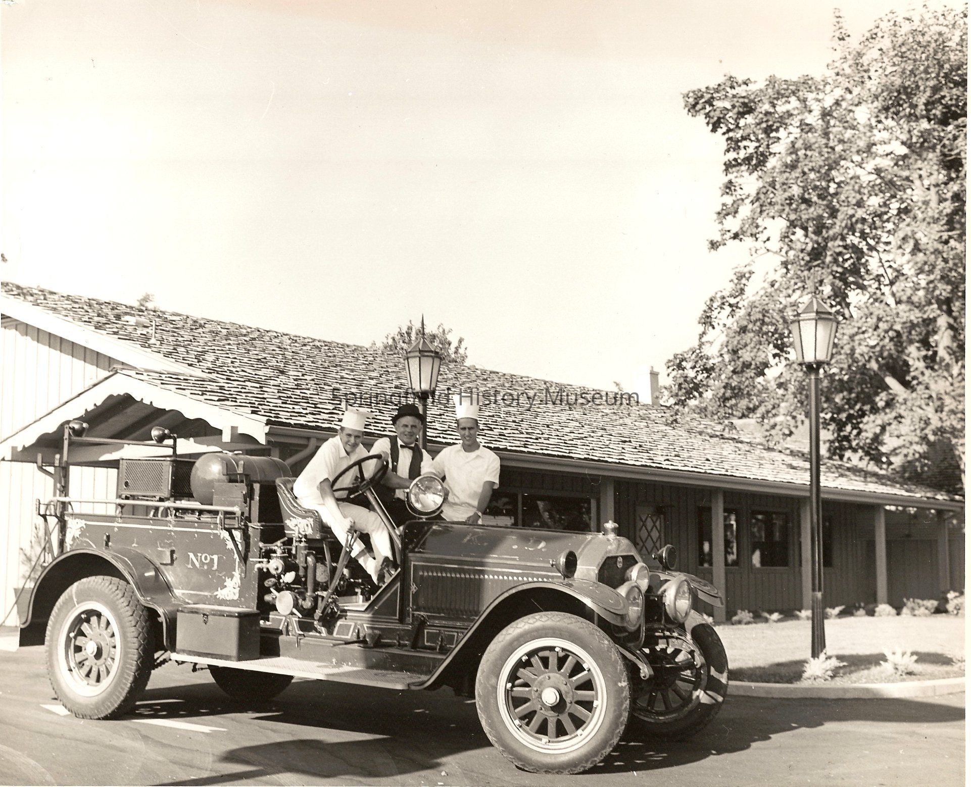Photograph of Norman Kolln (center) and 2 unknown men on each side of him, on a old Fire Truck outside at Pietro's Pizza, located at 4006 Franklin Blvd, Eugene, Oregon, undated
