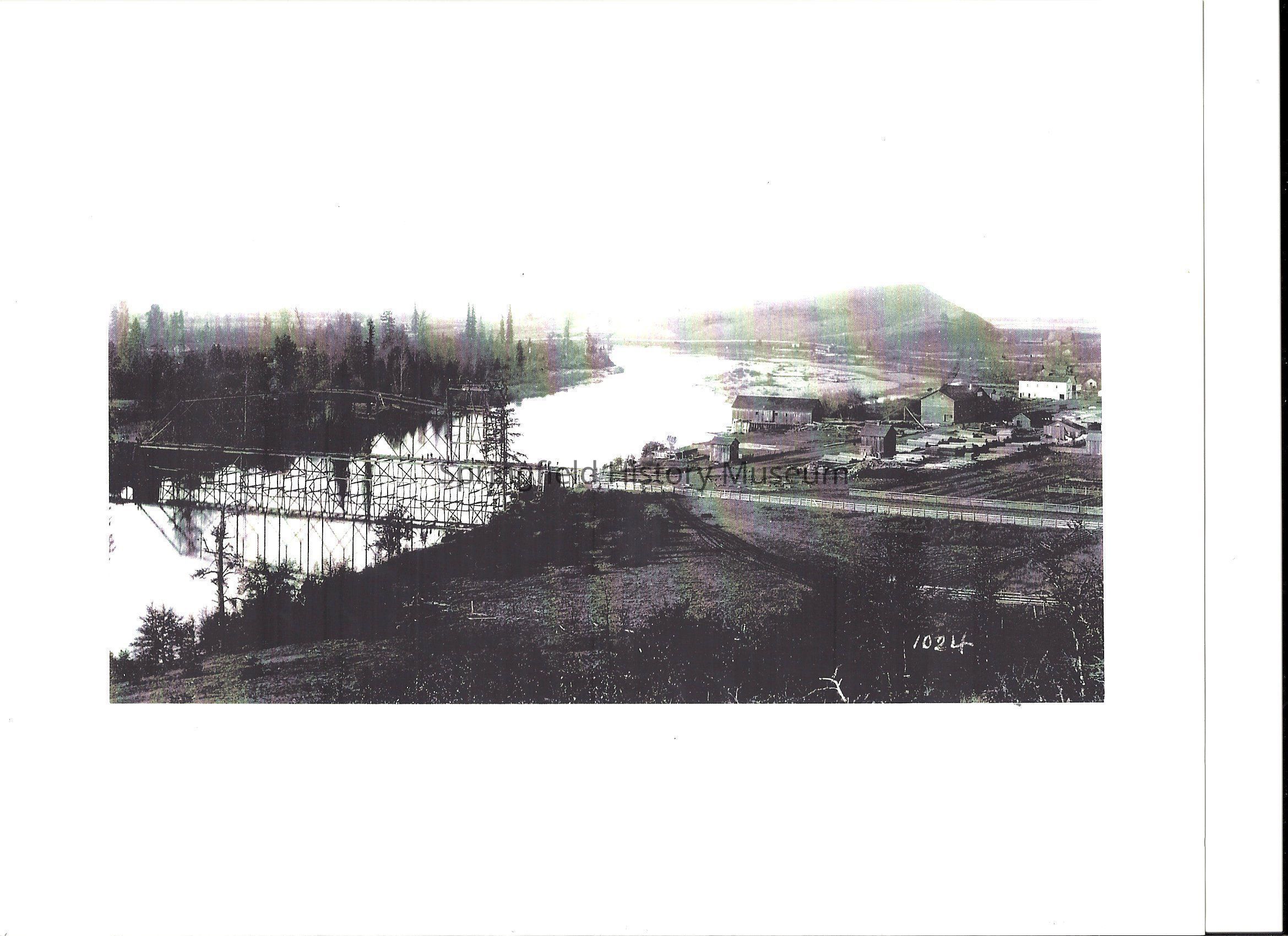Photograph of northwest view of the Springfield Flouring Mill and Steel Bridge, Springfield, Oregon, 1882Entry/Object ID
