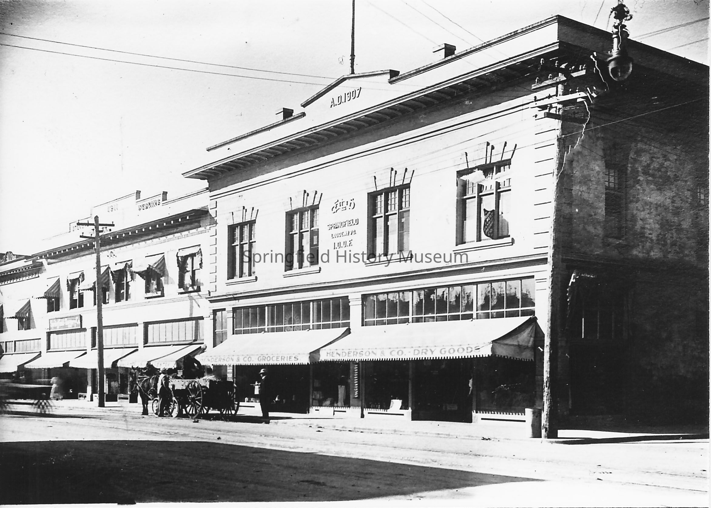 Odd Fellows building on Main St., Henderson and Company Dry Goods, with horse drawn wagon in front; circa 1910.