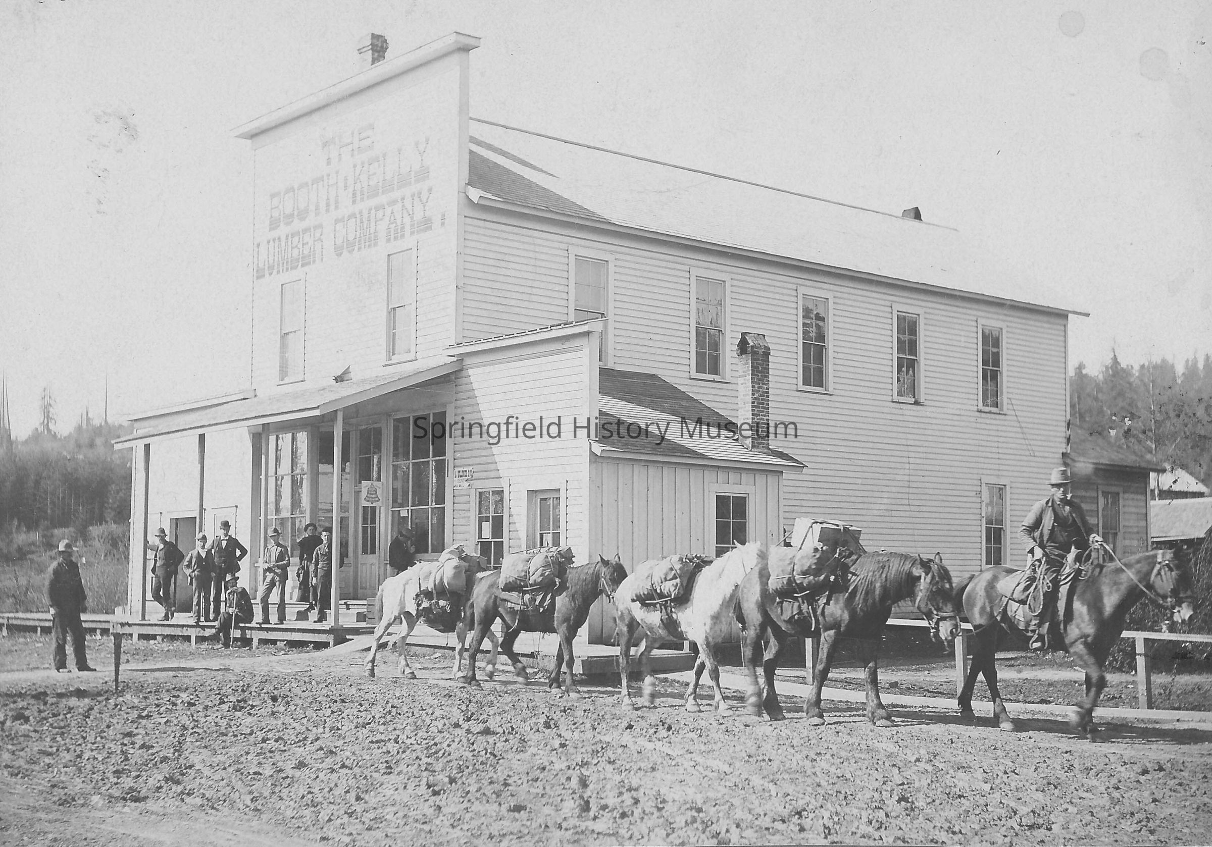 Business & Industry, Logging, Wendling, Saginaw, Booth-Kelly Lumber Company, Horses, Pack Train, H.R. Rose, Logging, Business, Mohawk Region--Wendling, Cottage Grove Region--Saginaw, Business & Industry--Booth-Kelly Lumber Company, Logging--Buildings, Transportation--Animal--Horses, People--Groups & Individuals