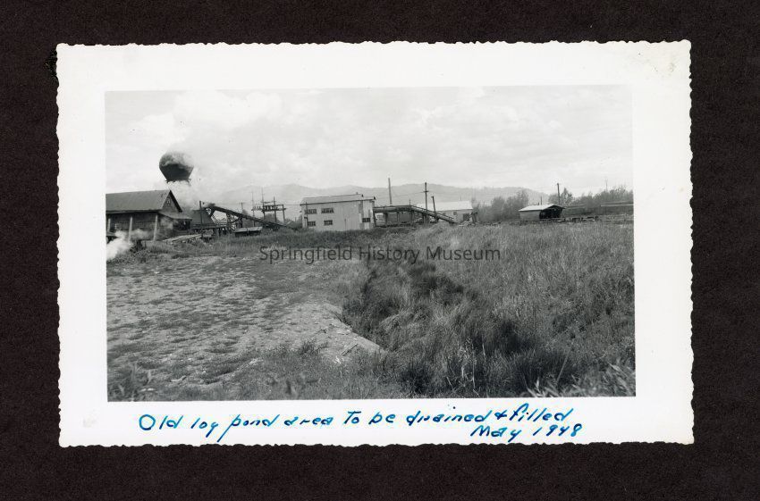 Photograph of "old pond area to be drained and filled, May 1948" (in pen at the bottom of the photograph), at Booth-Kelly Lumber Mill