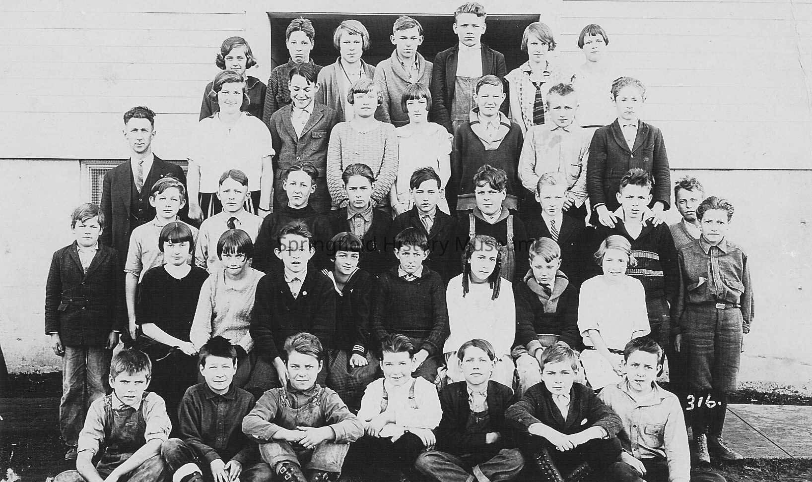 Photograph of five rows of older students with male teacher standing at left end of rows. Marked 316. Springfield, Oregon, Lincoln School, undatedPhotograph Details