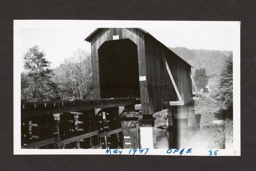 Photograph of OP&E covered wooden bridge in unknown location, on bottom in pen: "May 1947, OP&E, 38"Made/Created