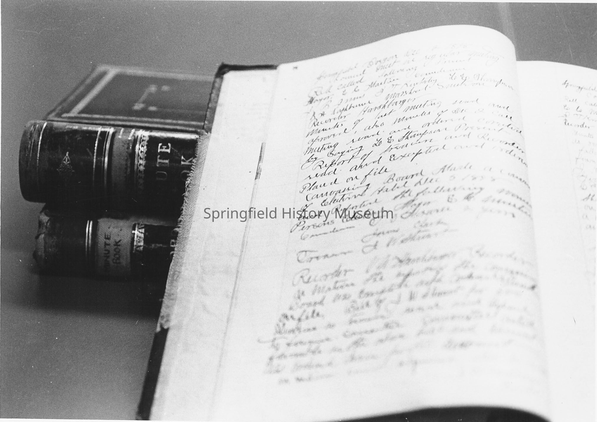 An opened record book, resting on two closed books; no identification of what the record books are. no date, Springfield News photo.