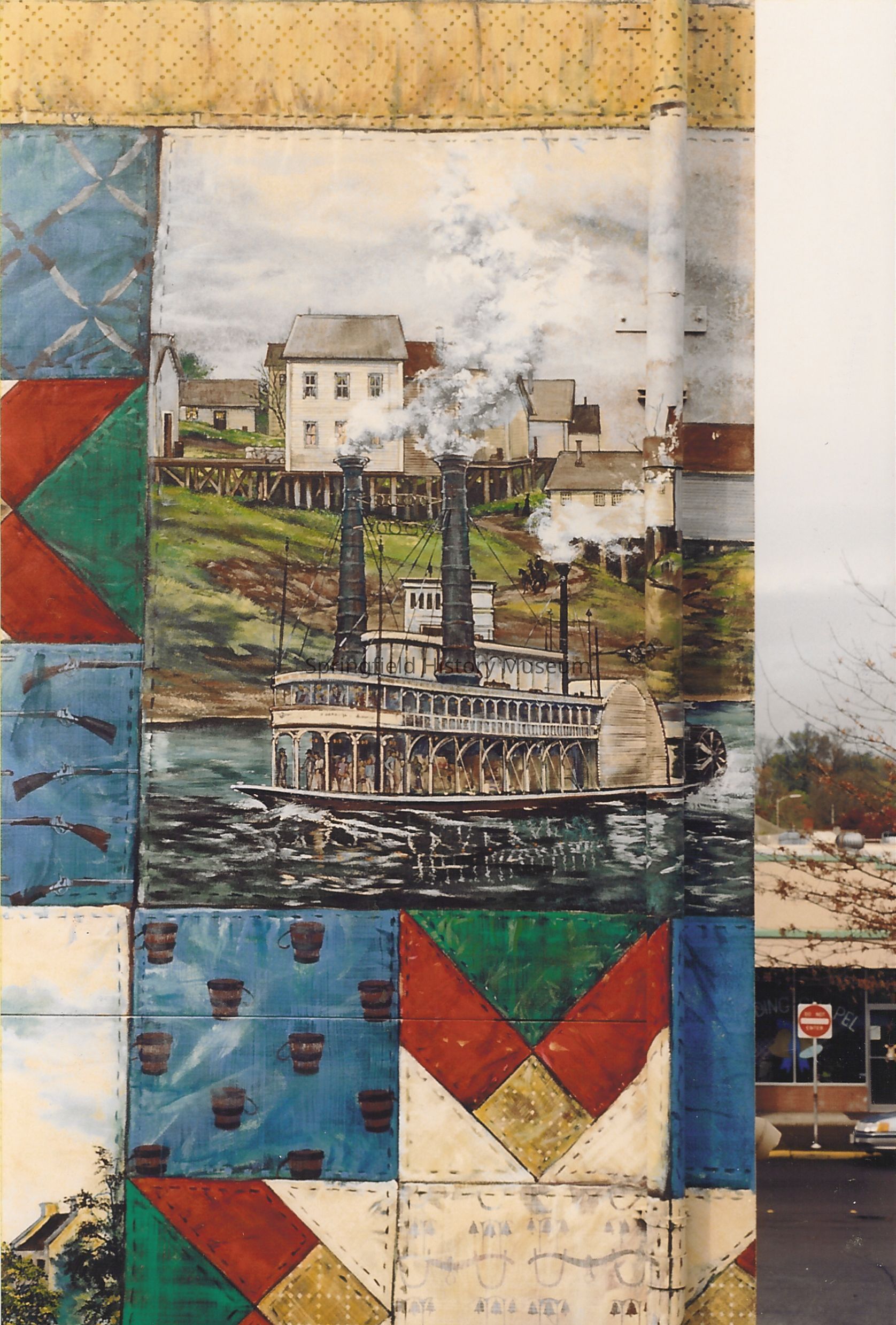 Oregon Trail mural detail of Paddle-wheel steamboat. Painted by Anne Woodruff Murray in 1993 - 1994.Photograph Details
