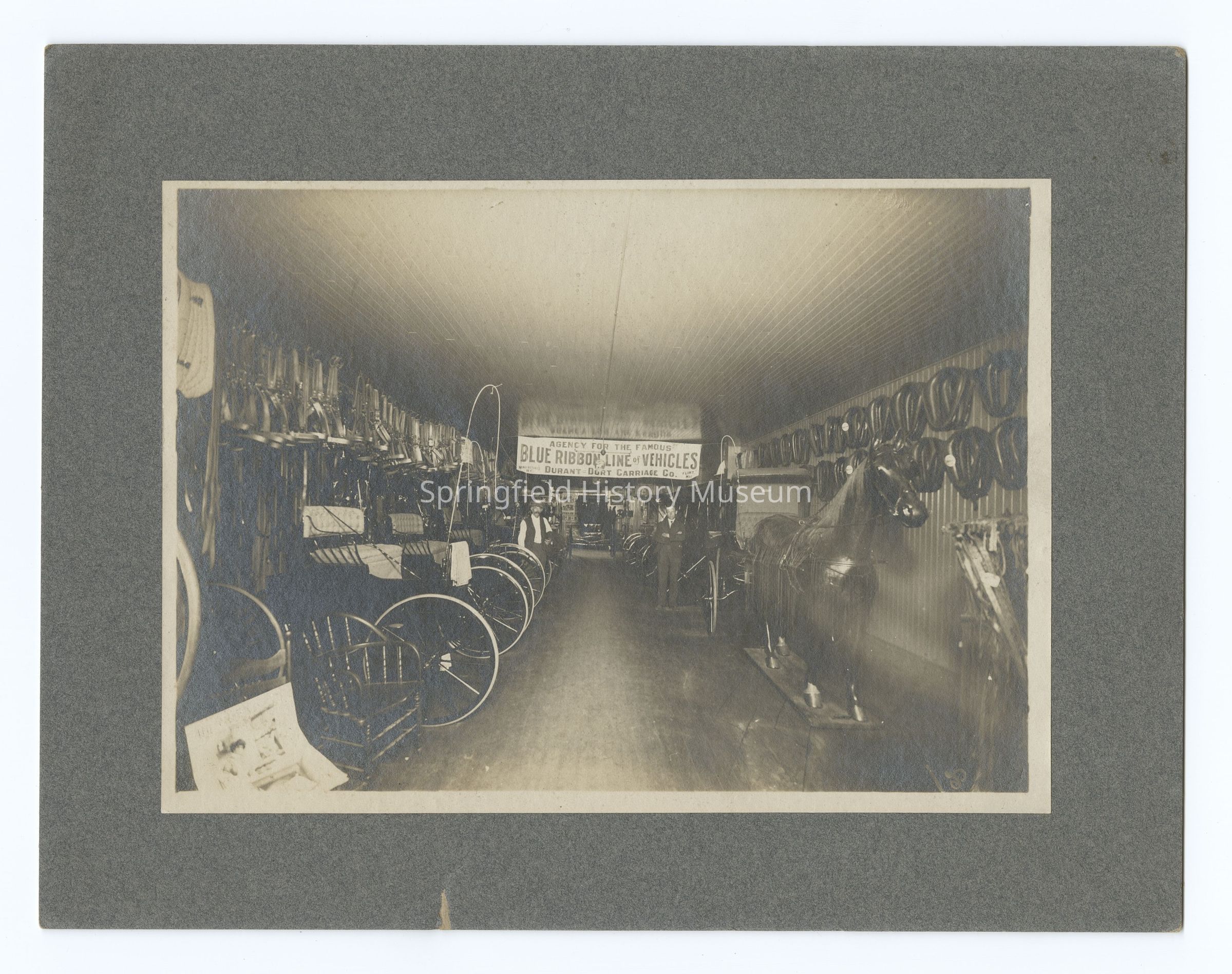 Photograph of Otto Scherer's Buick Store, Palmyra, Wisconsin, circa 1901-1911. Banner reads: 'Agency for the famous Blue Ribbon Line of Vehicles, Durant Dort Carriage Co."Photograph Details